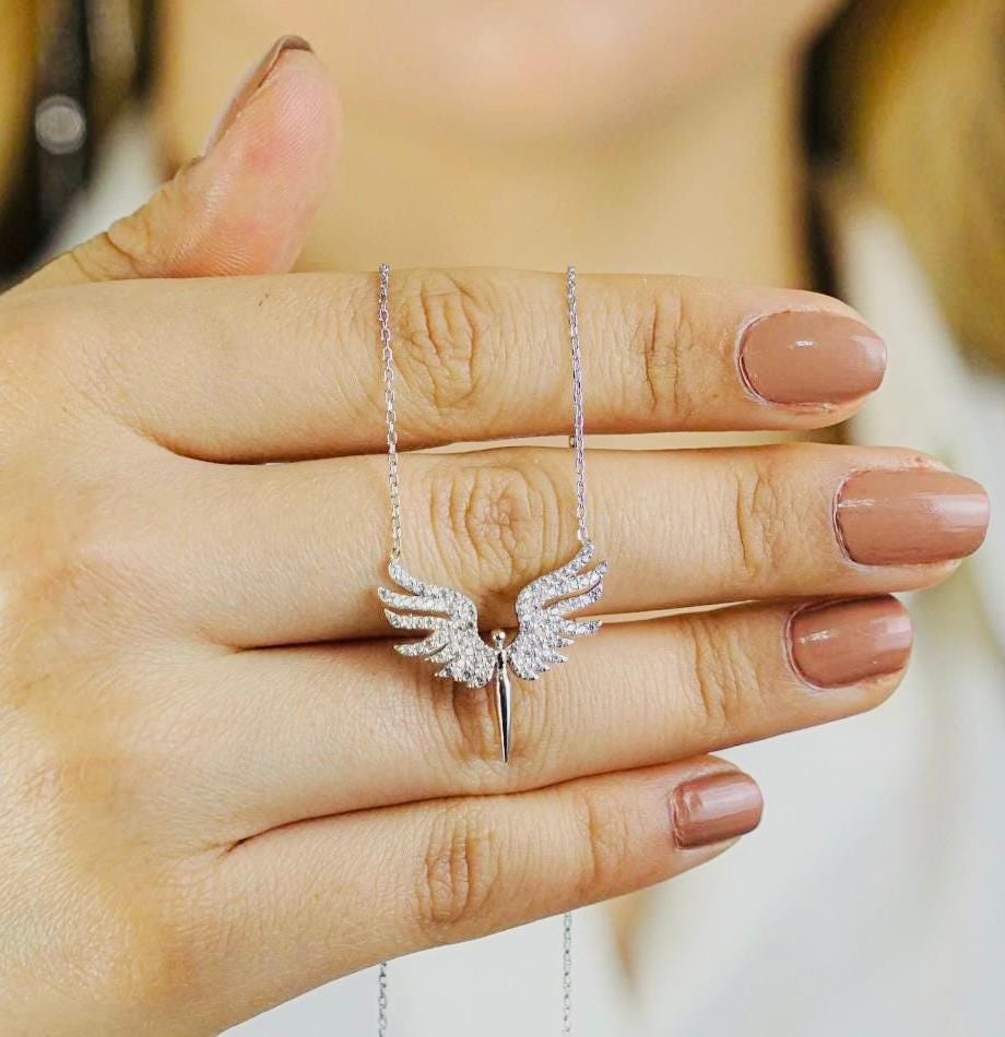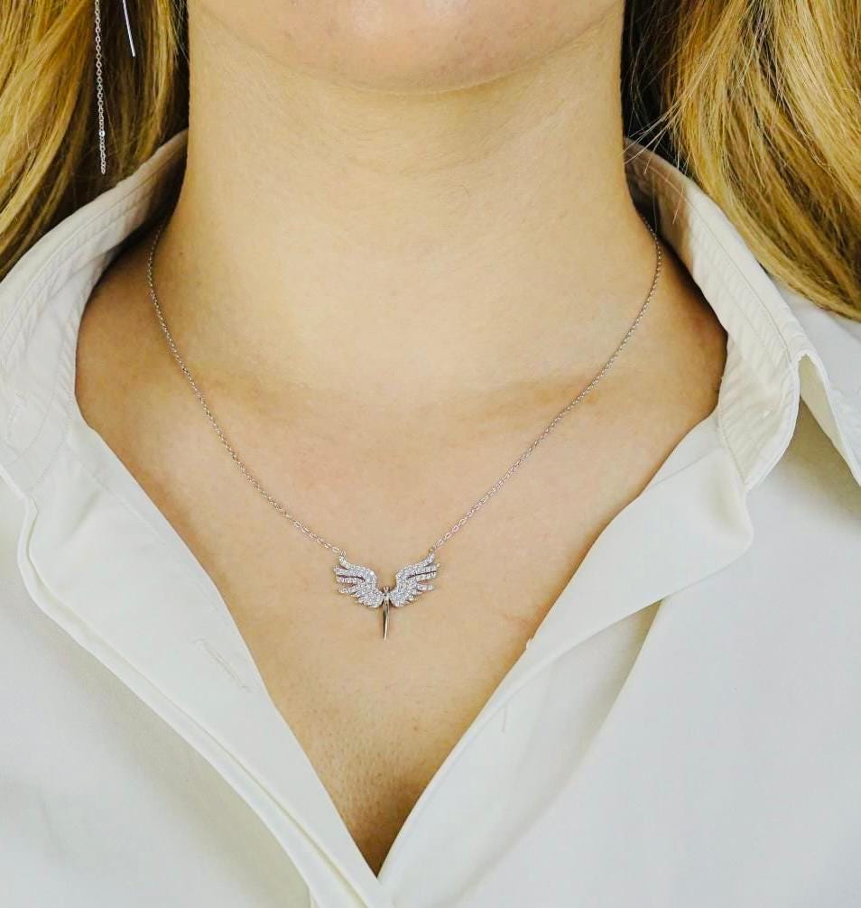 Description This bold and elegant Large Angel Necklace with White Zircon stones is crafted from 925 sterling silver with a polished finish. Symbolizing grace and protection, it’s a meaningful accessory perfect for everyday wear or as a thoughtful gift for someone special.