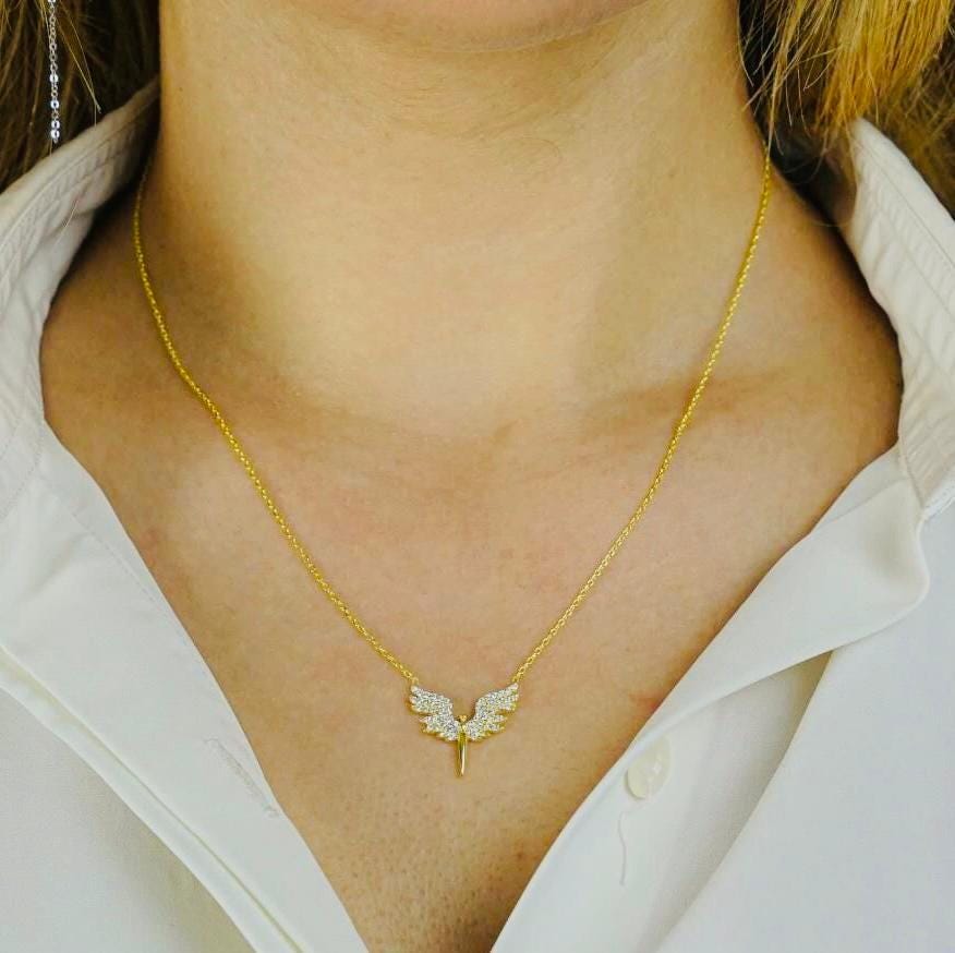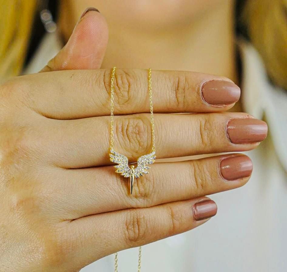 Description This elegant Angel Necklace with Zircon stones is crafted from 925 sterling silver and plated in gold for a radiant shine. A meaningful design that symbolizes grace and protection, perfect for both everyday wear and as a thoughtful gift for someone special.