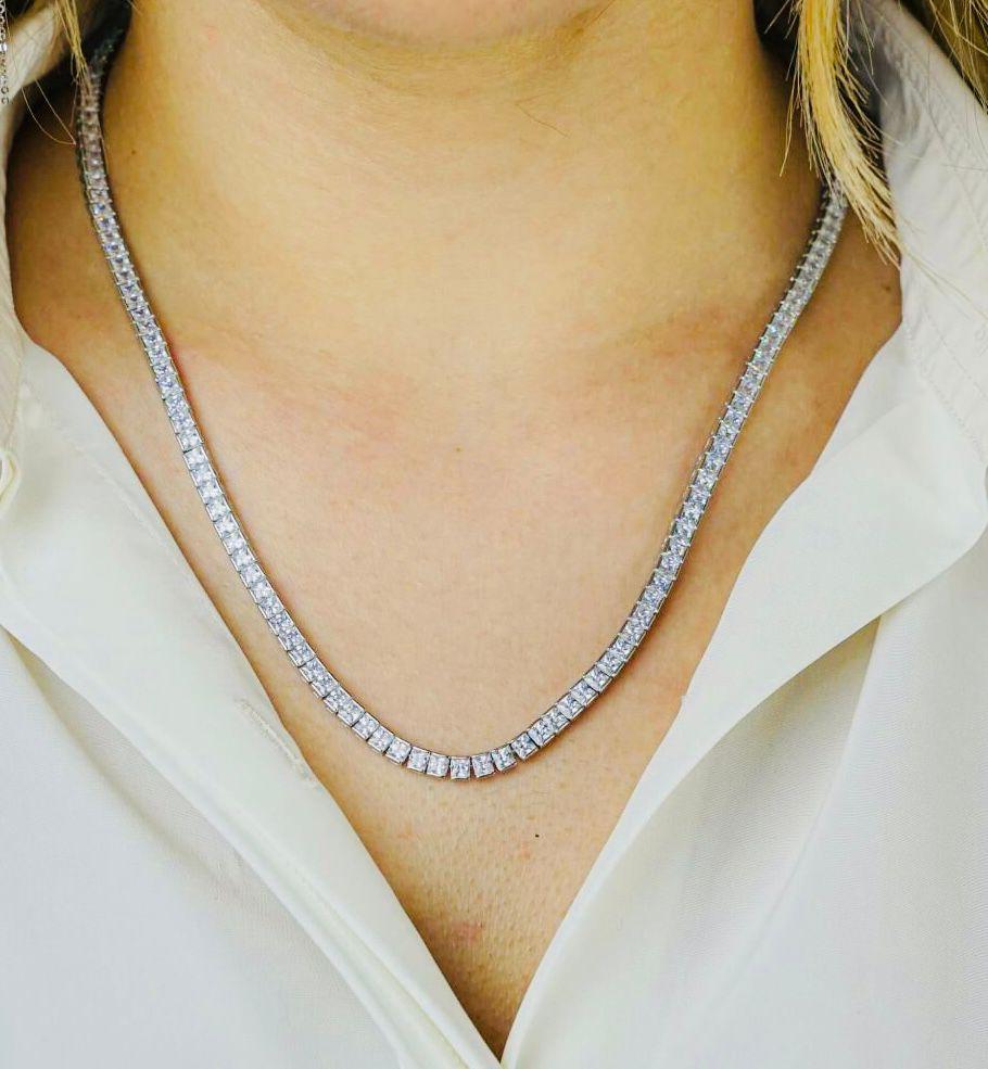 Description Make a bold statement with this Sterling Silver Square Tennis Necklace designed in a diamond-inspired style. With a polished finish and a width of 4 mm, this 50 cm chain is perfect for special occasions or as a luxurious everyday accessory.