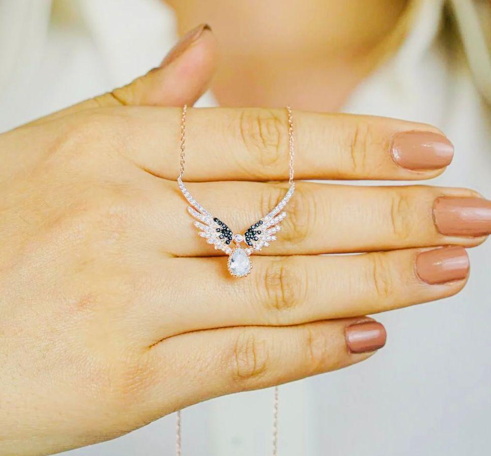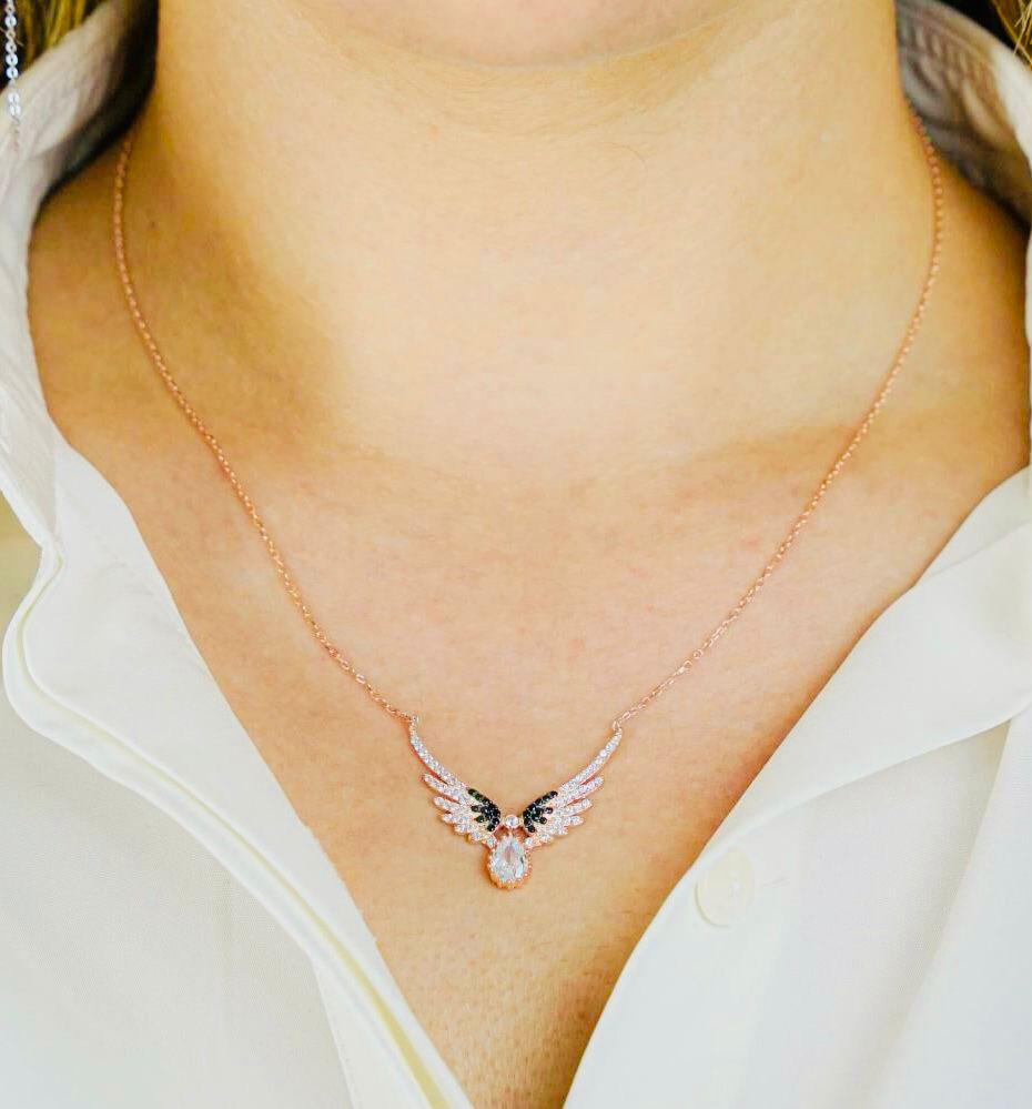 Description This elegant Angel Wings Necklace with a teardrop stone is crafted from 925 sterling silver and plated in rose gold for a delicate shine. Symbolizing protection and grace, it’s perfect for everyday wear or as a meaningful gift for someone special.