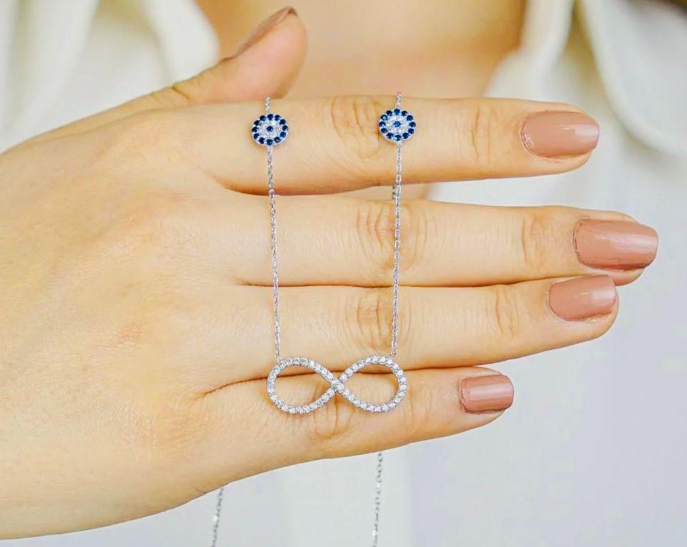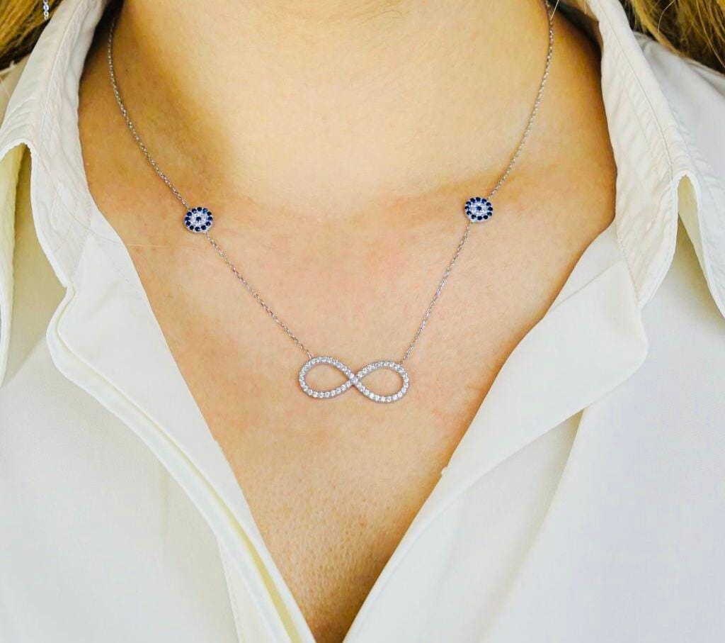 Description This unique Infinity Necklace with Evil Eye and Zircon stones combines elegance with symbolism. Crafted from 925 sterling silver, it represents protection, eternity, and style. Perfect for everyday wear or as a meaningful gift. Ships quickly within 1–2 business days in a protective box.