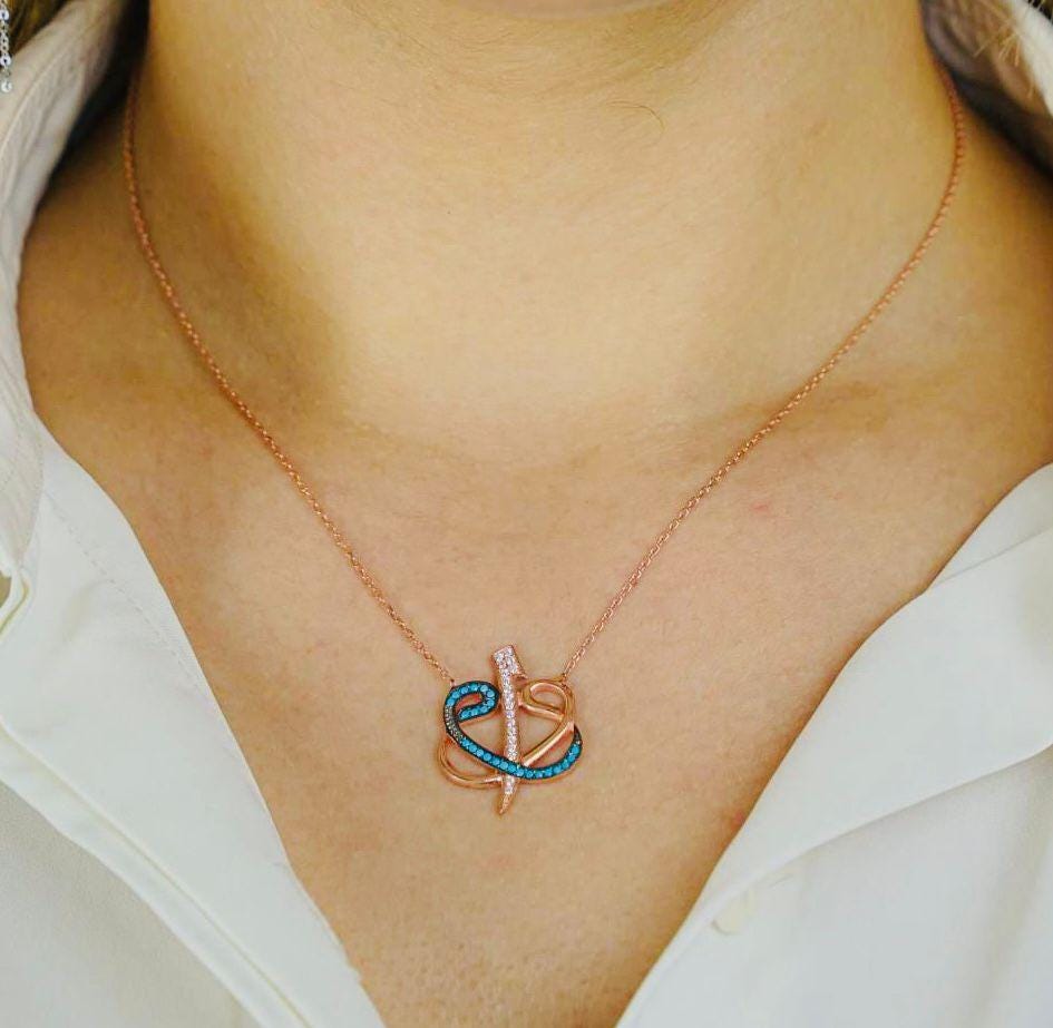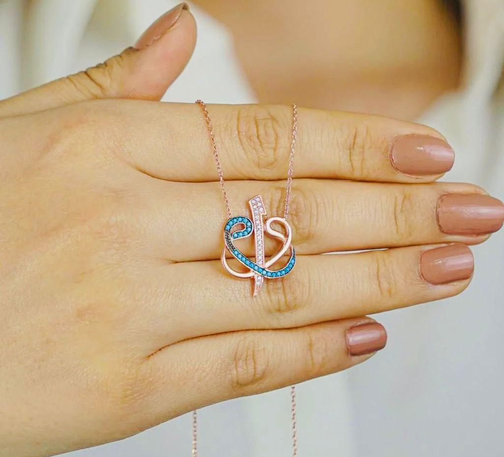 Description This meaningful Double Vav Elif Necklace is crafted from 925 sterling silver and adorned with turquoise, zircon, and nano stones. A unique design that blends elegance with spirituality, perfect for everyday wear or as a thoughtful gift.