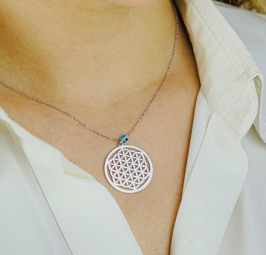 Description This meaningful Flower of Life Necklace with Evil Eye design is crafted from 925 sterling silver with a polished finish. A unique symbol of harmony and protection, it’s perfect for everyday wear or as a thoughtful gift for someone special.