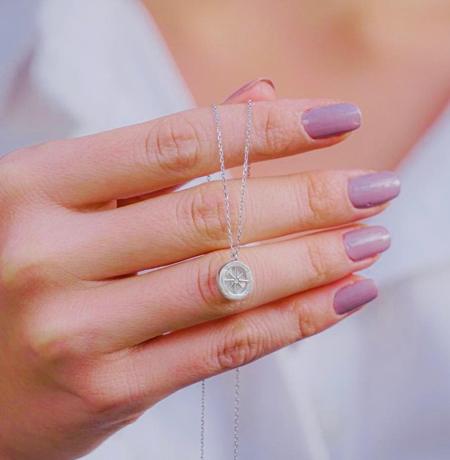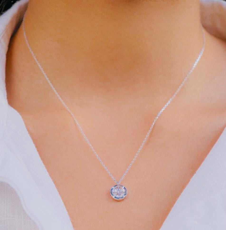 Description This elegant Compass Necklace with Mother of Pearl is crafted from 925 sterling silver with a polished finish. A meaningful design symbolizing direction and guidance, it’s a delicate accessory perfect for everyday wear or as a thoughtful gift.