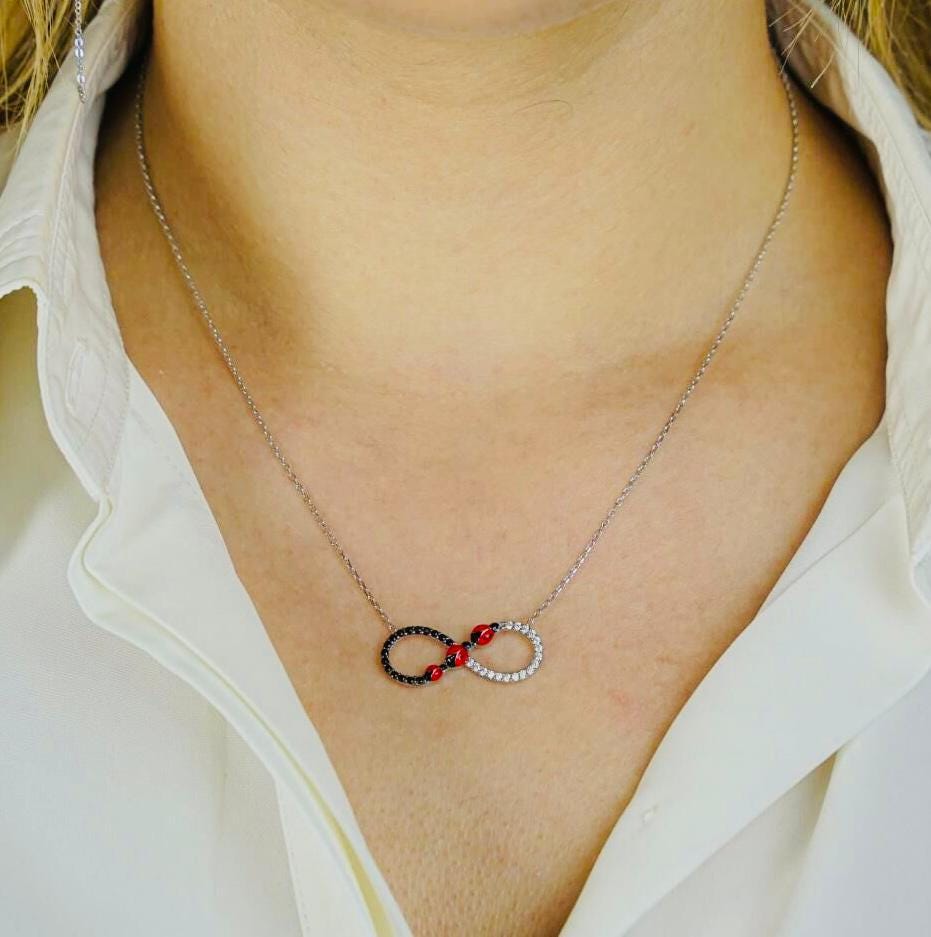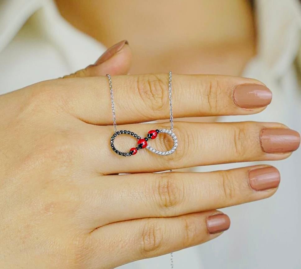 Description This meaningful Infinity Necklace with Ladybug Motif is crafted from 925 sterling silver with a polished finish. Symbolizing love, luck, and eternity, it’s a charming accessory perfect for everyday wear or as a thoughtful gift for someone special.