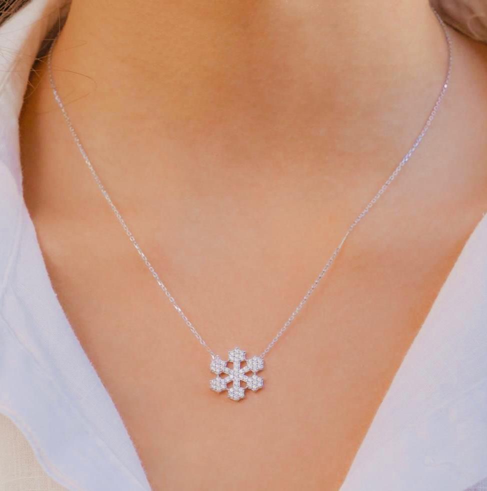 Description This elegant Snowflake Necklace with White Zircon stones is crafted from 925 sterling silver with a polished finish. A sparkling design symbolizing purity and uniqueness, perfect for everyday wear or as a thoughtful winter-inspired gift.