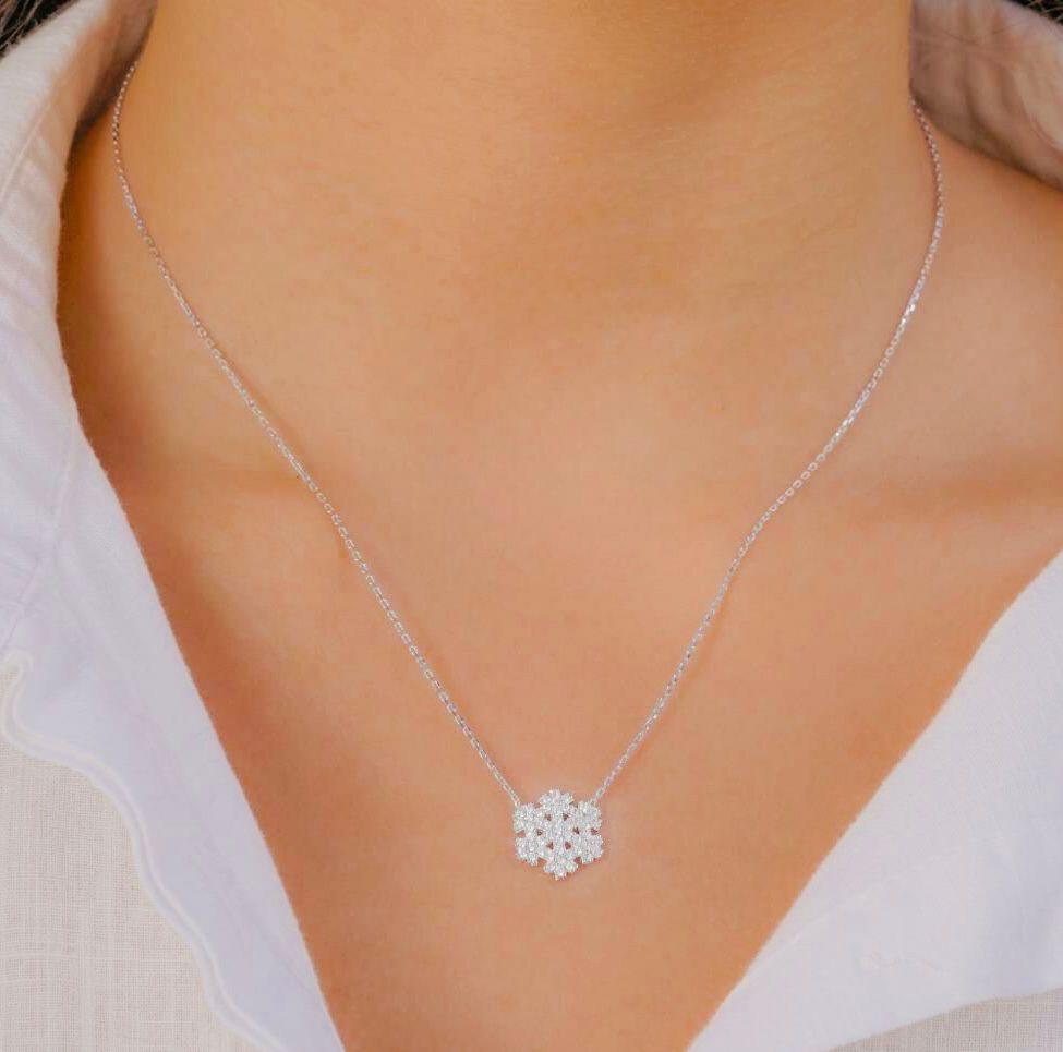Description This delicate Snowflake Necklace with White Zircon stones is crafted from 925 sterling silver with a polished finish. A timeless design symbolizing purity and uniqueness, perfect for everyday wear or as a thoughtful gift for someone special.