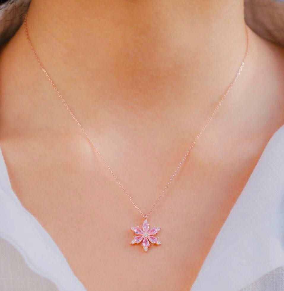 Product Details • Size: 2.1 cm x 2.1 cm • Average weight: 2.7 g • Chain length: 45 cm • Material: 925 sterling silver • Surface clarity: Polished finish • Rose gold plated • Stone: Pink zircon