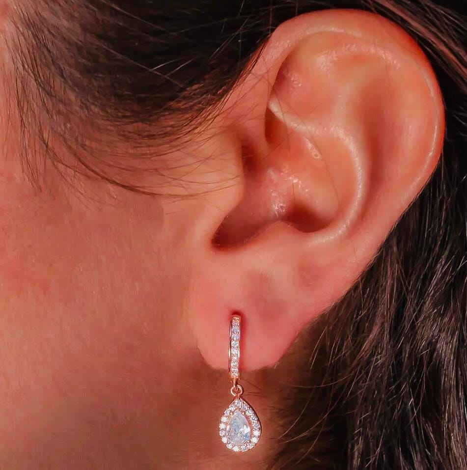 Description These elegant Drop Earrings with White Teardrop Zircon stones are crafted from 925 sterling silver and plated in rose gold for a radiant shine. A timeless design combining elegance and sparkle, perfect for everyday wear or as a thoughtful gift for someone special.