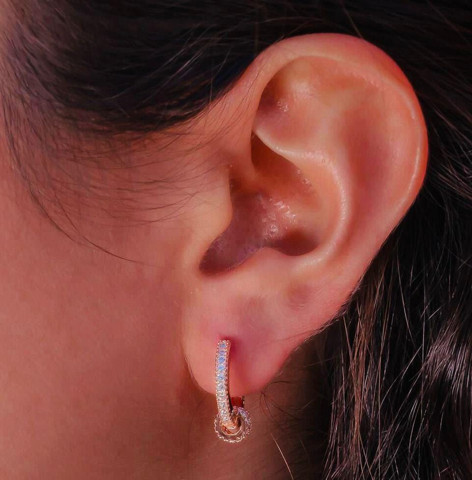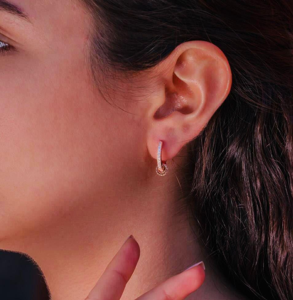 Description These elegant Hoop Earrings with White Zircon stones are crafted from 925 sterling silver and plated in rose gold for a radiant shine. A sleek and timeless design that adds sparkle to any outfit, perfect for everyday wear or as a thoughtful gift.