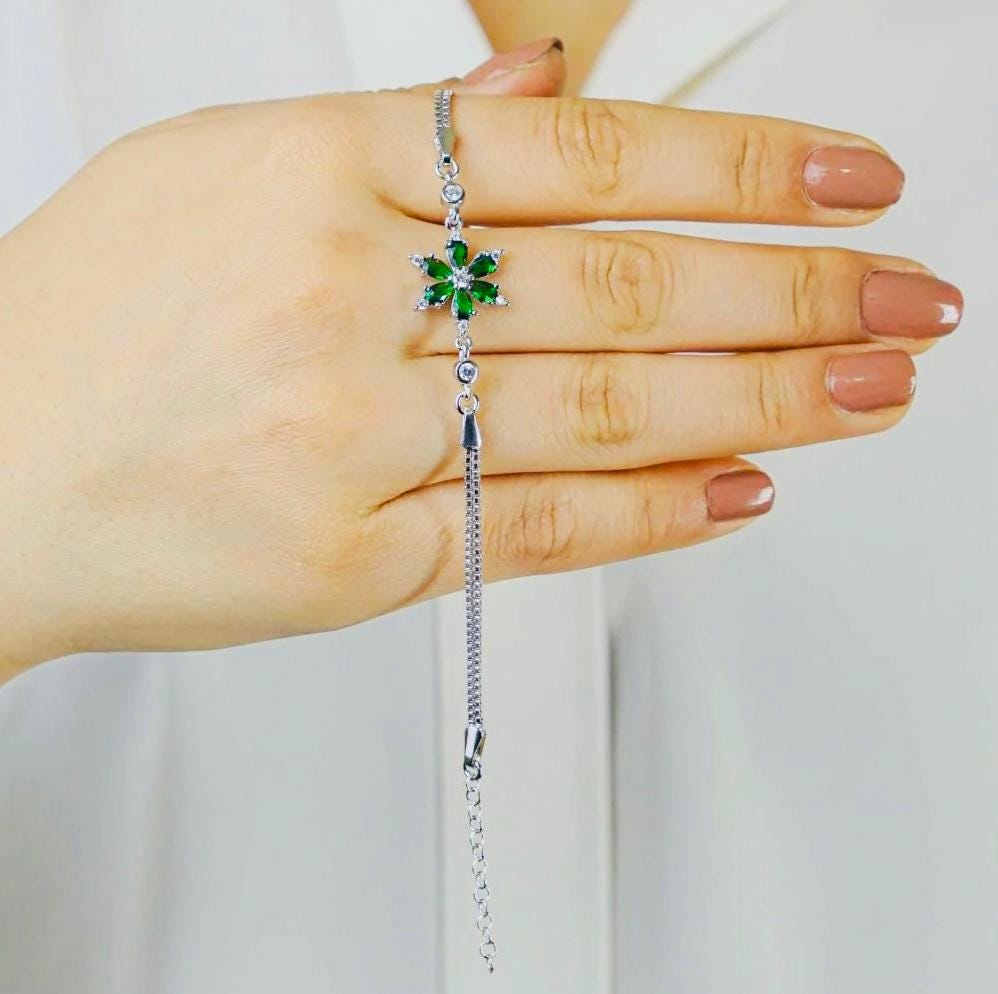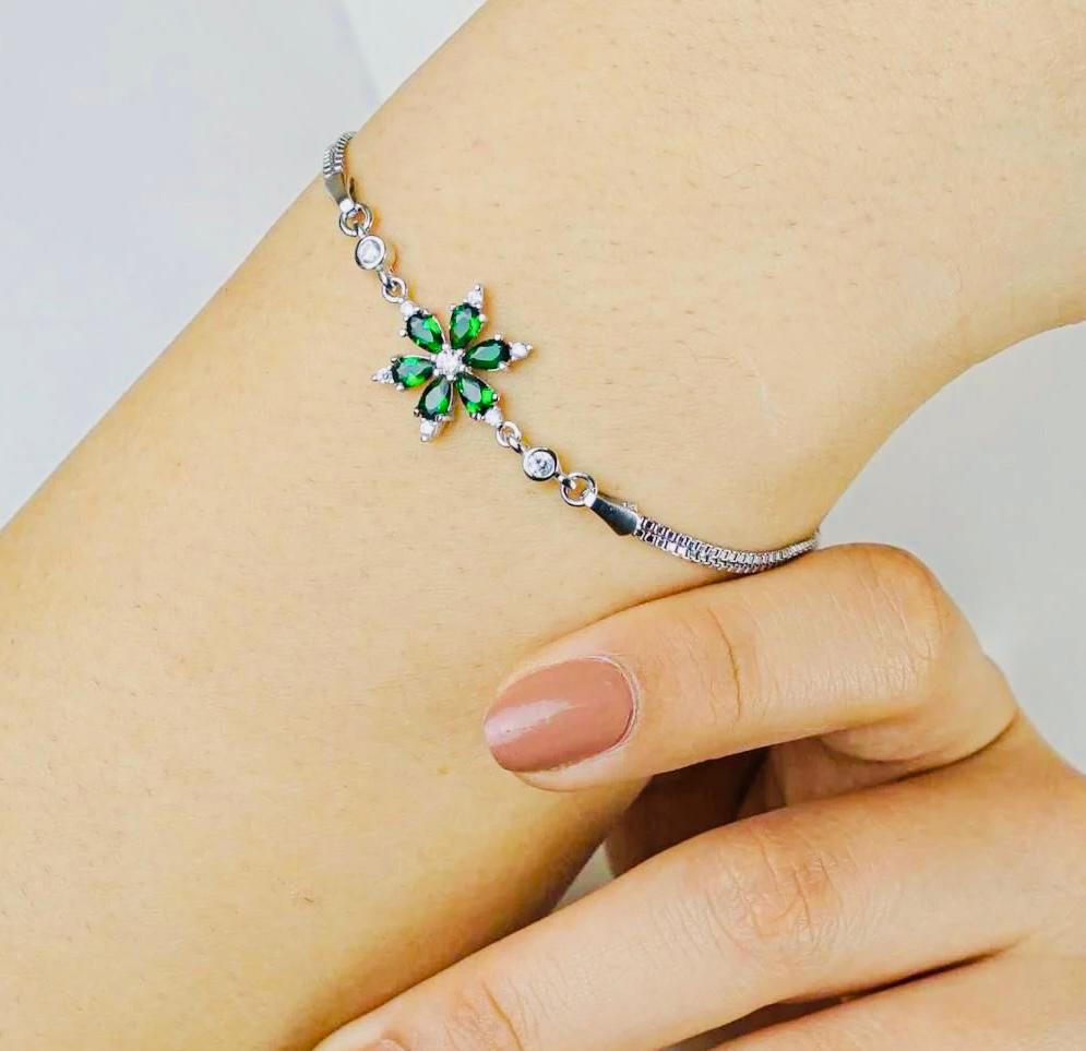 Description This elegant Green Lotus Flower Bracelet is crafted from 925 sterling silver. Symbolizing purity and renewal, the lotus flower design adds a meaningful touch, while the green detail brings a modern elegance. Weighing 4.6 g and measuring 19 cm, it’s perfect for both daily wear and special occasions.