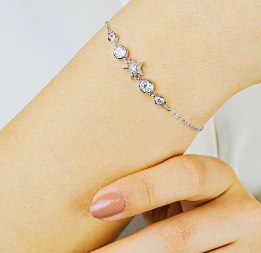 Description This delicate Star and Solitaire Bracelet is crafted from 925 sterling silver, featuring a minimalist star design paired with a sparkling stone. Weighing 3.8 g and measuring 19 cm, it’s lightweight, stylish, and perfect for both everyday wear and special occasions. A meaningful and elegant gift option.