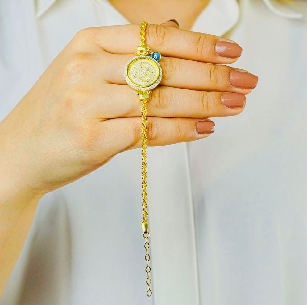 Description This elegant Tugra Bracelet is crafted from 925 sterling silver, gold plated for a luxurious finish, and features a protective evil eye detail. With a sturdy rope chain and meaningful Ottoman-inspired design, it weighs 9.5 g and measures 20 cm. Perfect for daily wear or as a unique and symbolic gift.