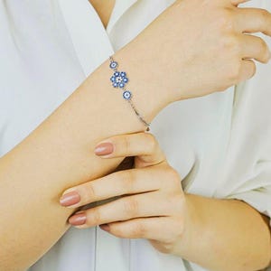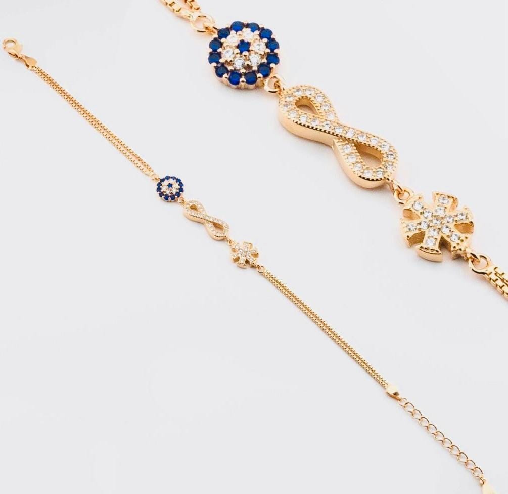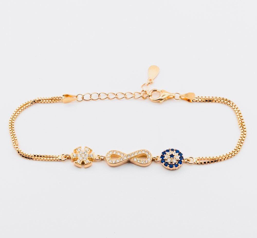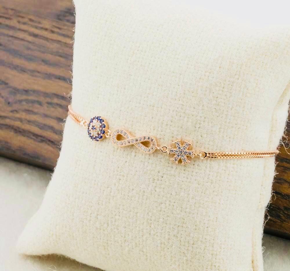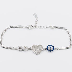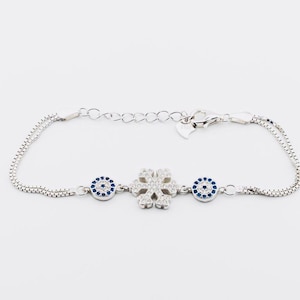 Description This meaningful Snowflake Bracelet with Evil Eye and Infinity Symbol is crafted from 925 sterling silver. The snowflake symbolizes uniqueness, the infinity symbol represents everlasting love, and the evil eye offers protection. A stylish and symbolic piece perfect for daily wear or as a thoughtful gift.