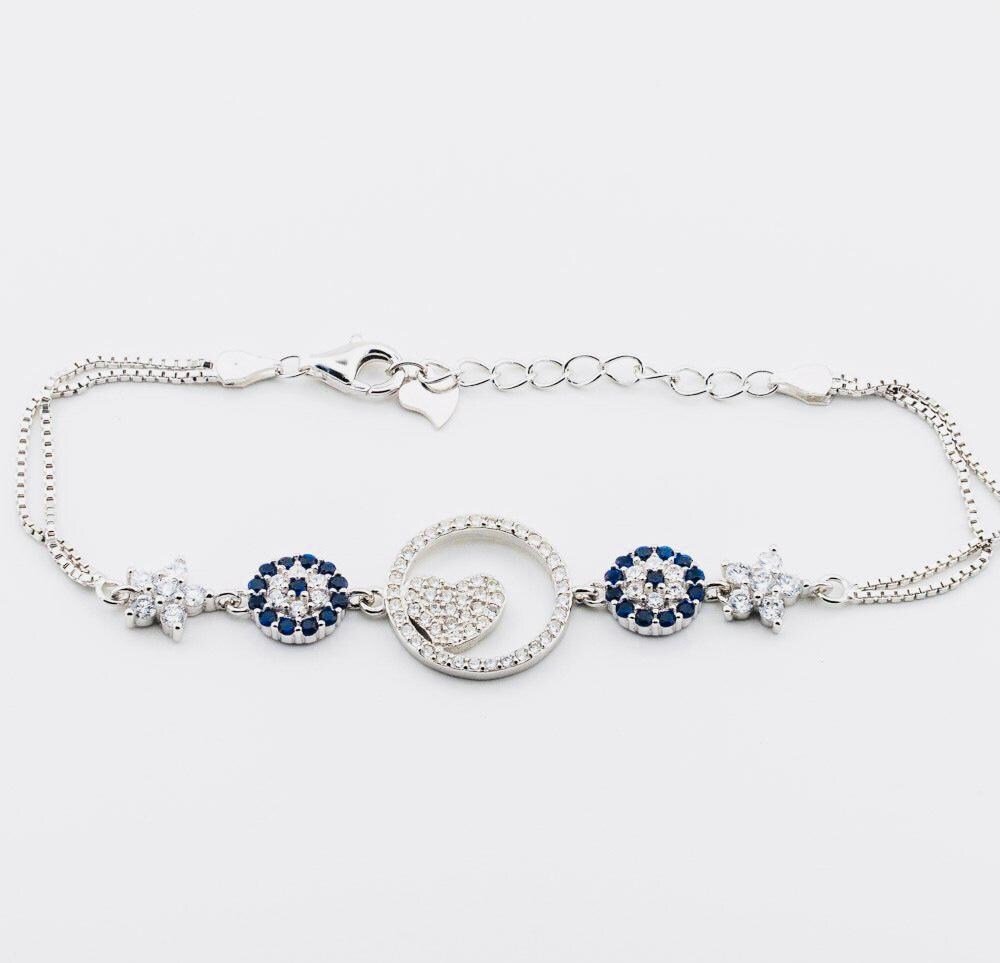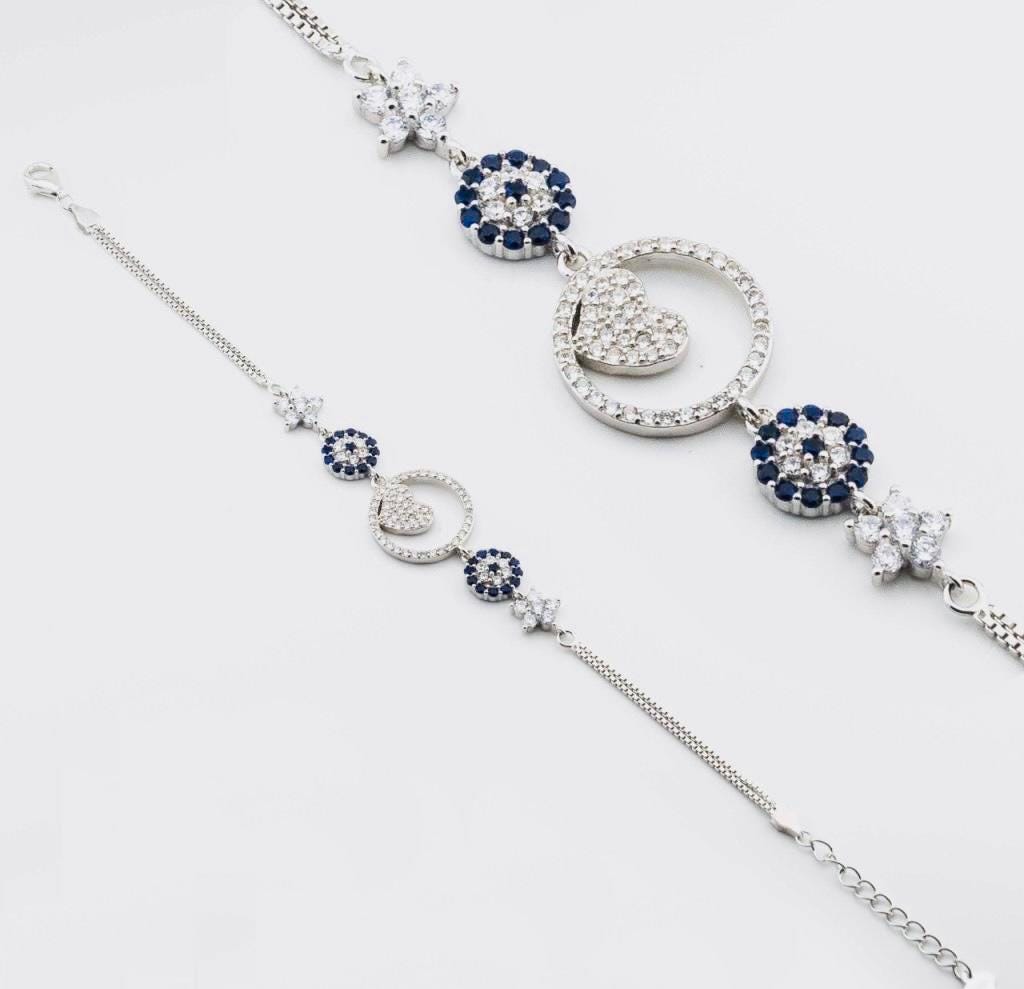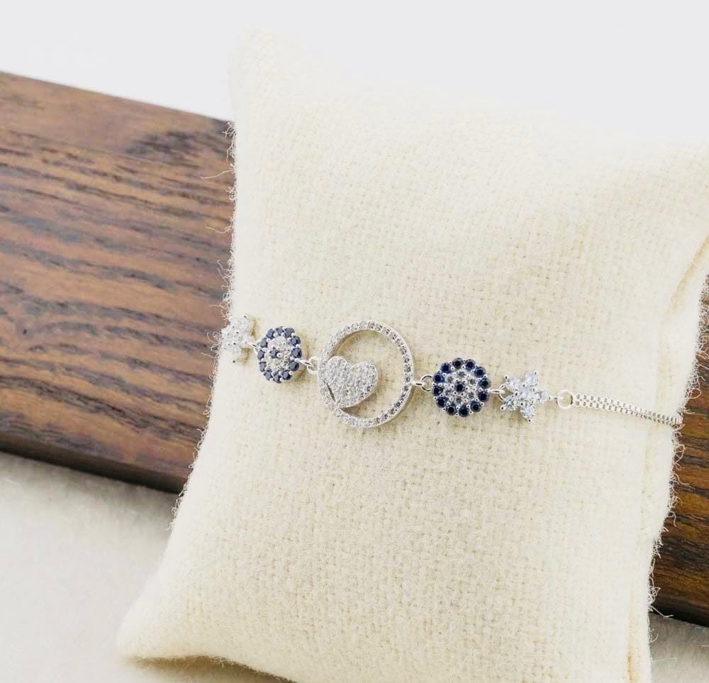 Description This unique Evil Eye Heart Bracelet with Zircon Stones is crafted from 925 sterling silver. The evil eye symbolizes protection, while the heart design represents love. Enhanced with sparkling zircon stones, it’s both meaningful and elegant. Ideal for everyday wear or as a thoughtful gift for someone special.