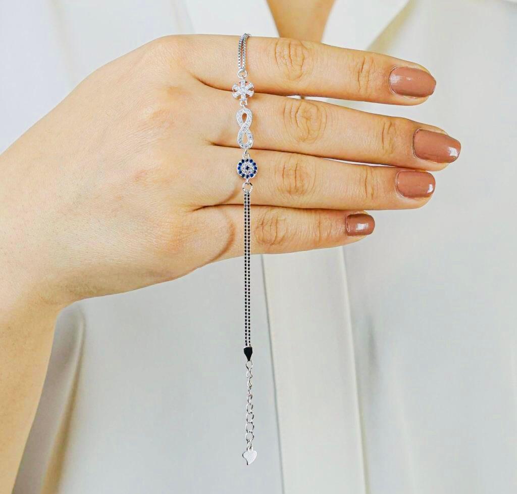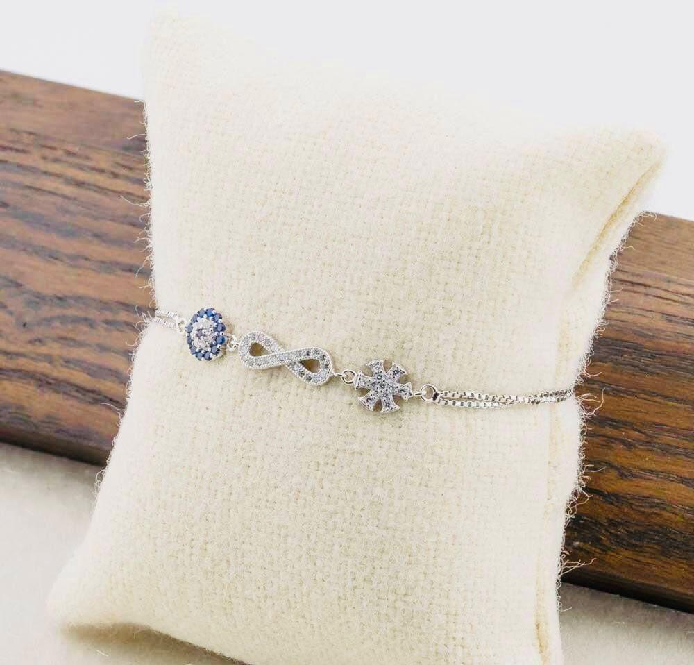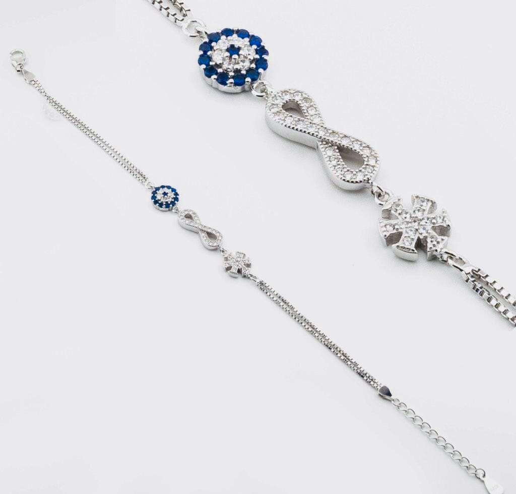 Description This elegant Evil Eye Infinity Snowflake Bracelet is crafted from 925 sterling silver. Combining symbolic designs, the evil eye represents protection, infinity symbolizes eternal bonds, and the snowflake reflects elegance and uniqueness. Perfect for everyday wear or as a meaningful gift.