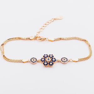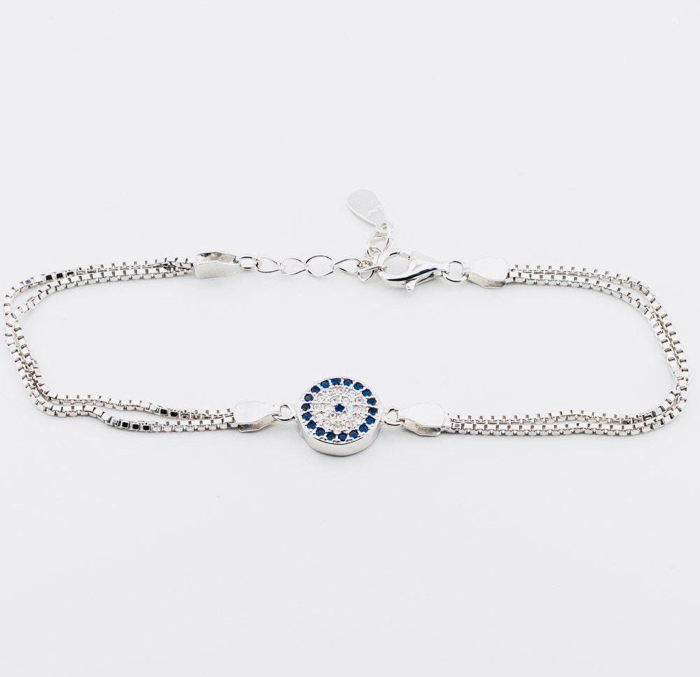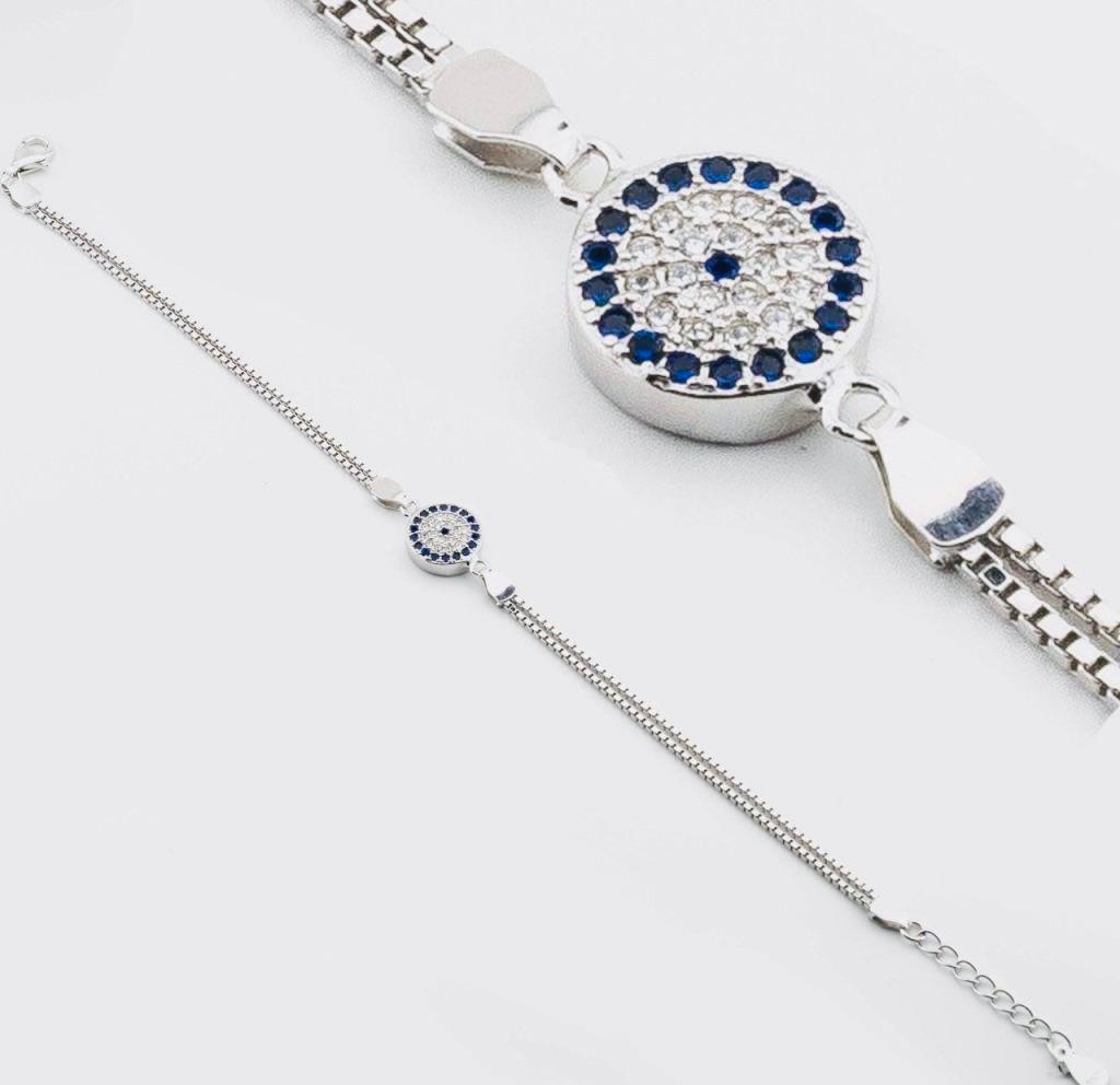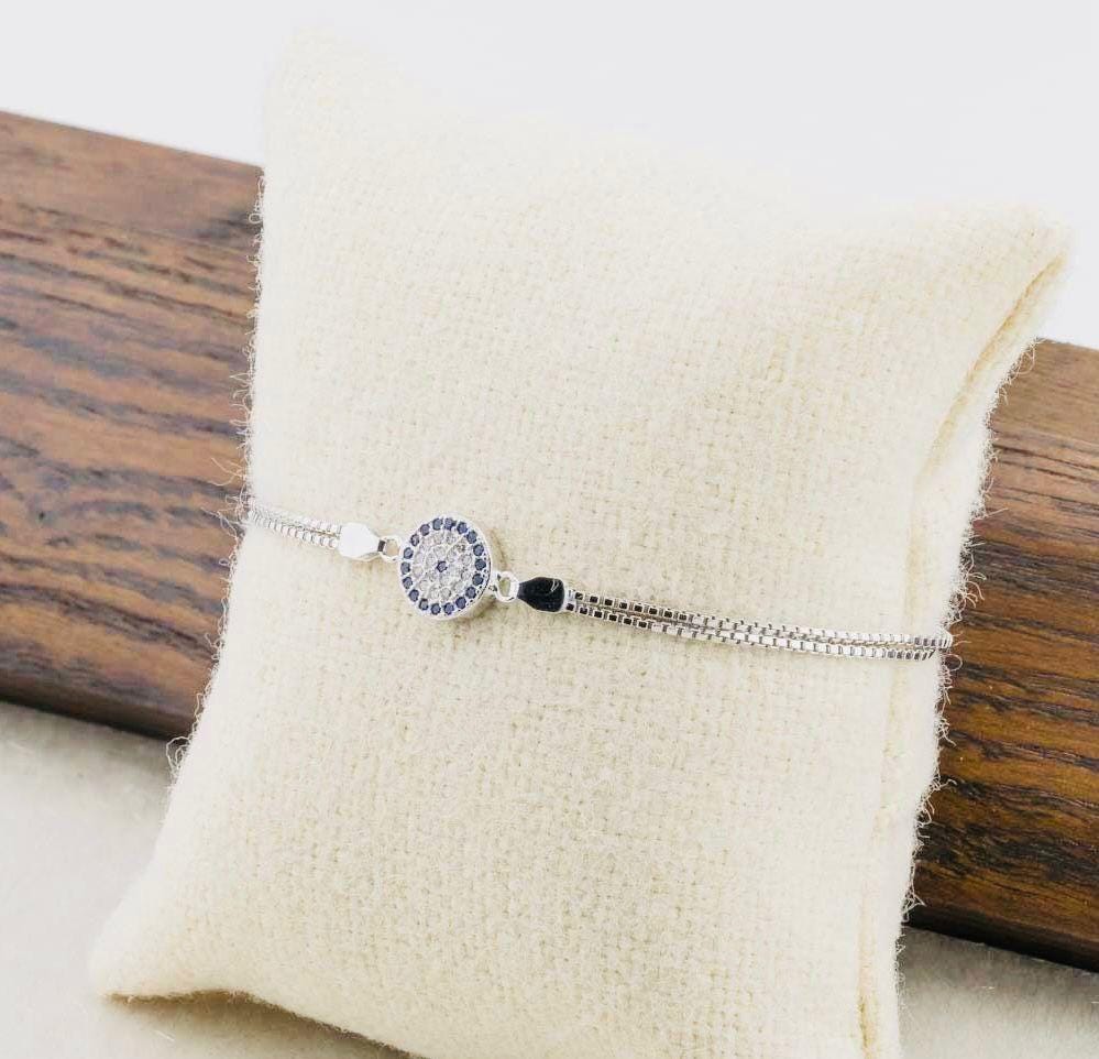 Description This elegant Evil Eye Bracelet with Zircon Stones is crafted from 925 sterling silver. The evil eye design symbolizes protection and good luck, while zircon stones add a sparkling finish. Perfect for everyday wear or as a meaningful gift for someone special.