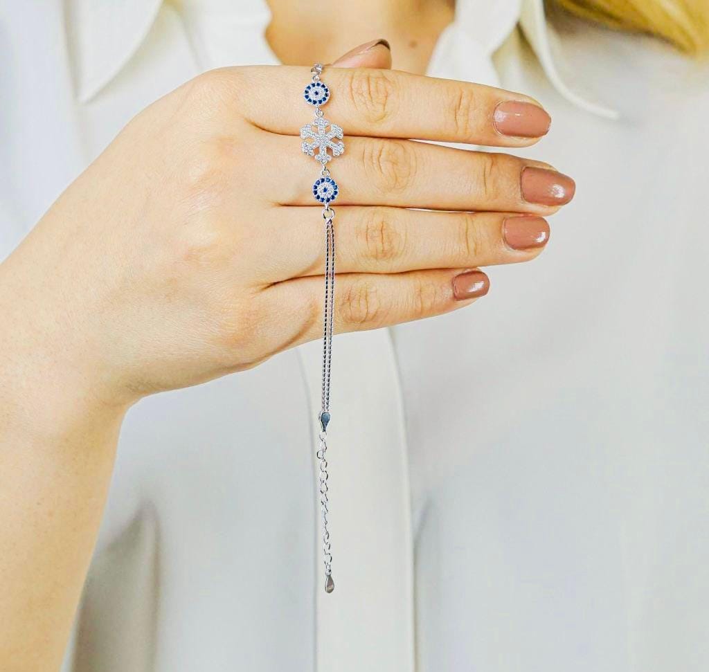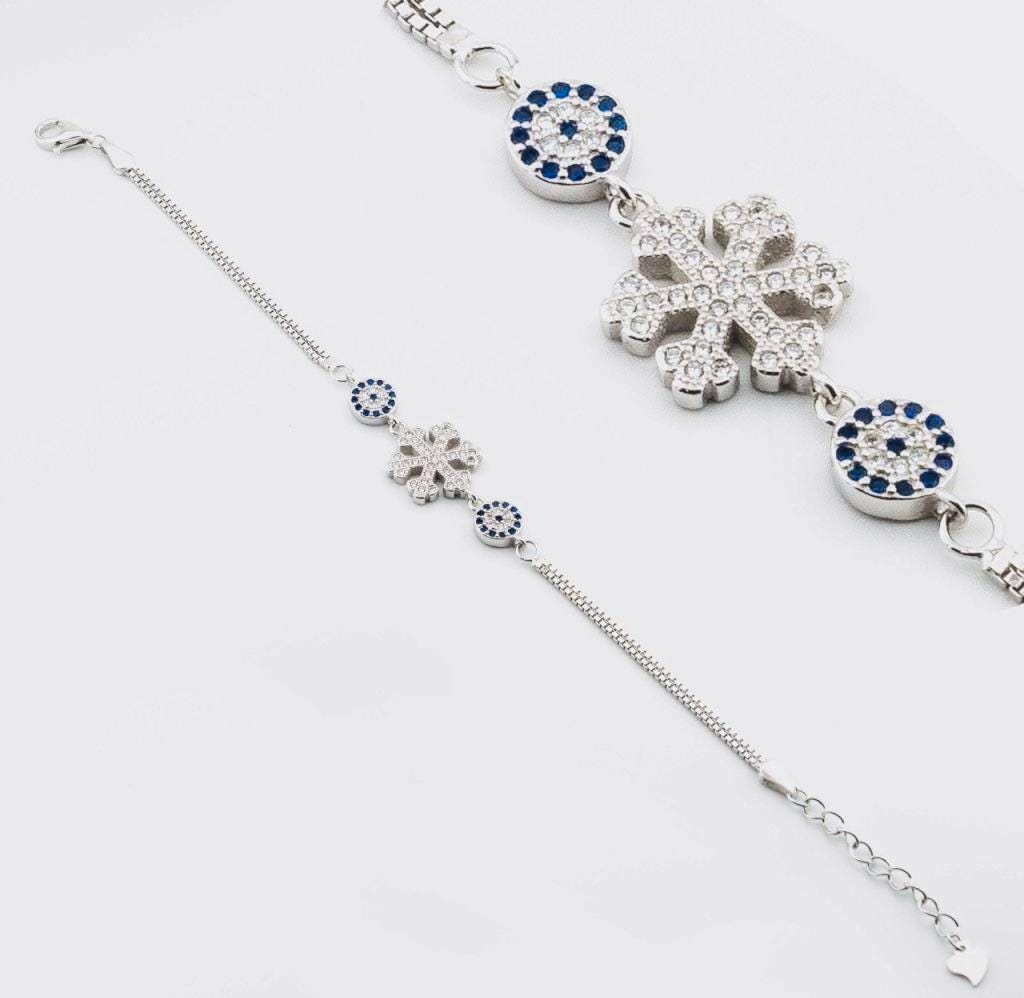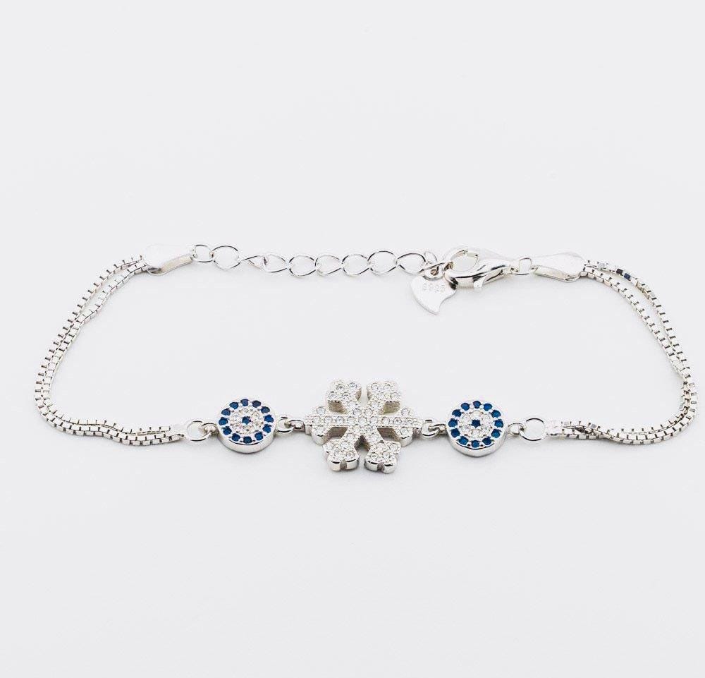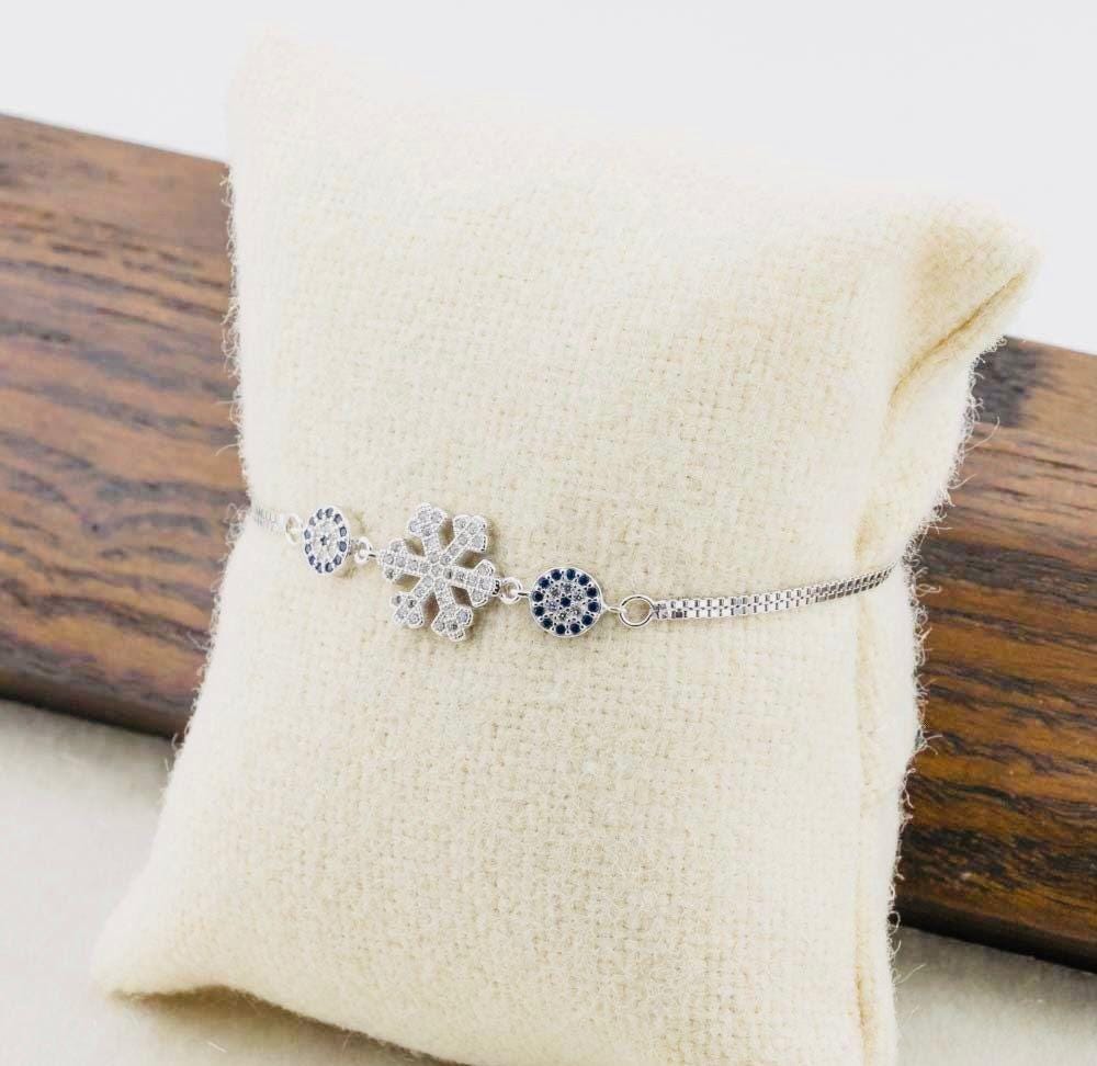 Description This delicate Evil Eye Snowflake Bracelet is crafted from 925 sterling silver. The snowflake design adds elegance, while the evil eye detail symbolizes protection and good fortune. Perfect for everyday wear or as a thoughtful gift for someone special.