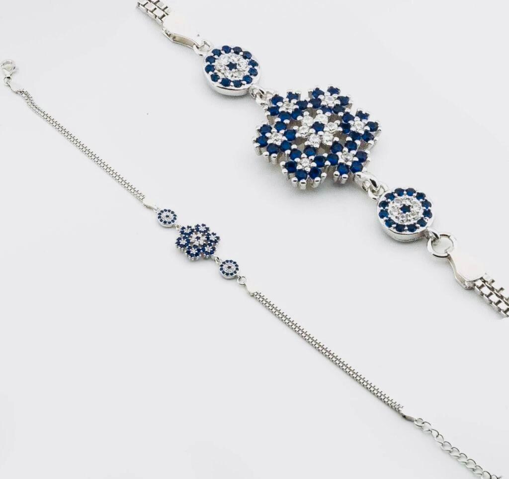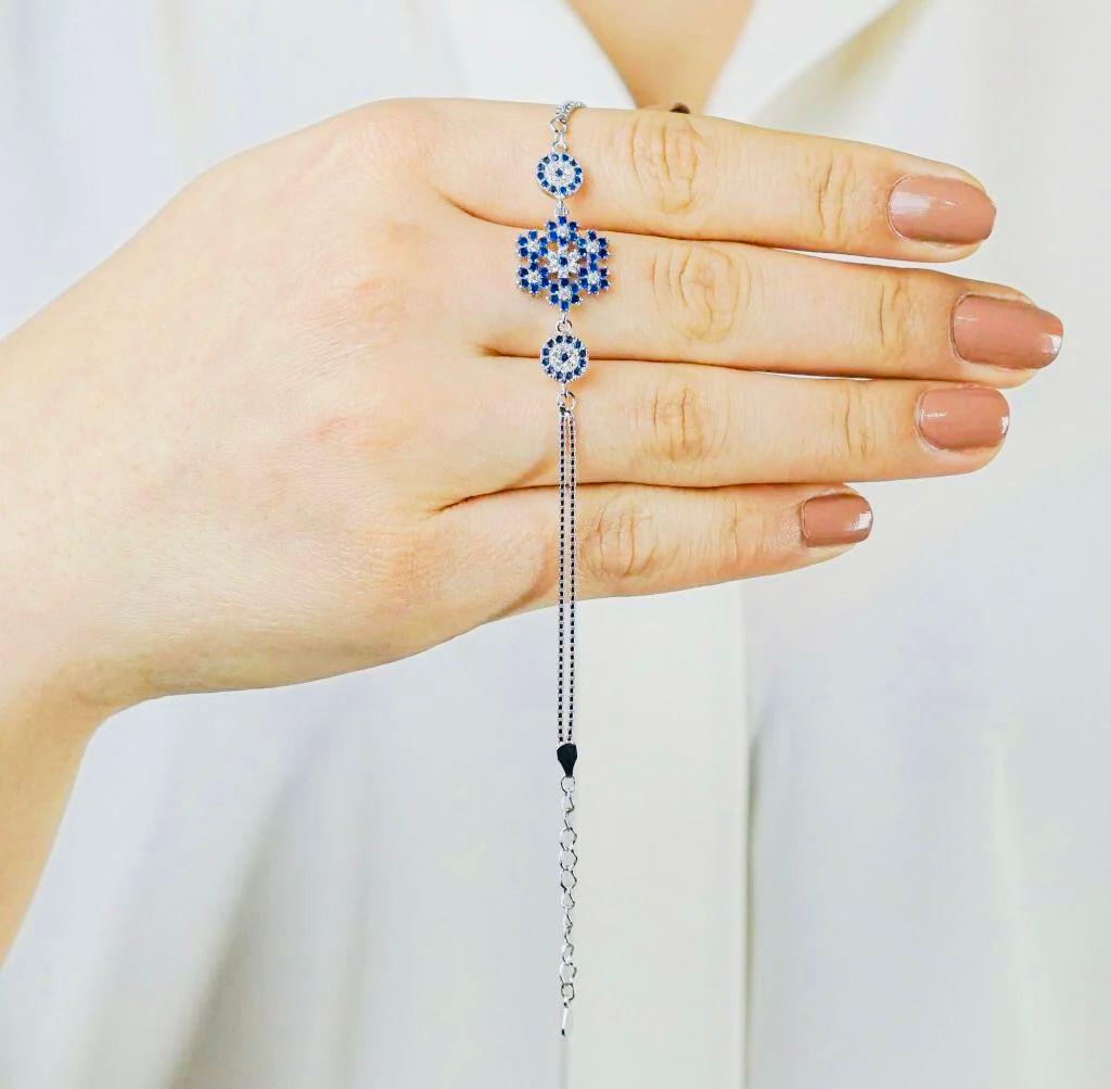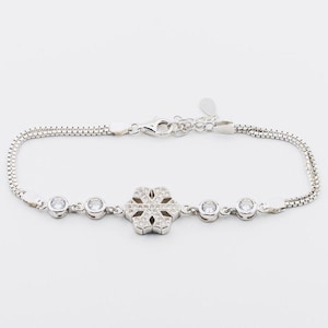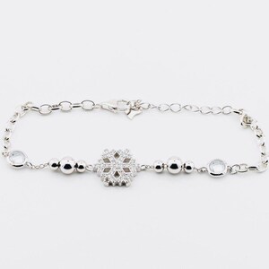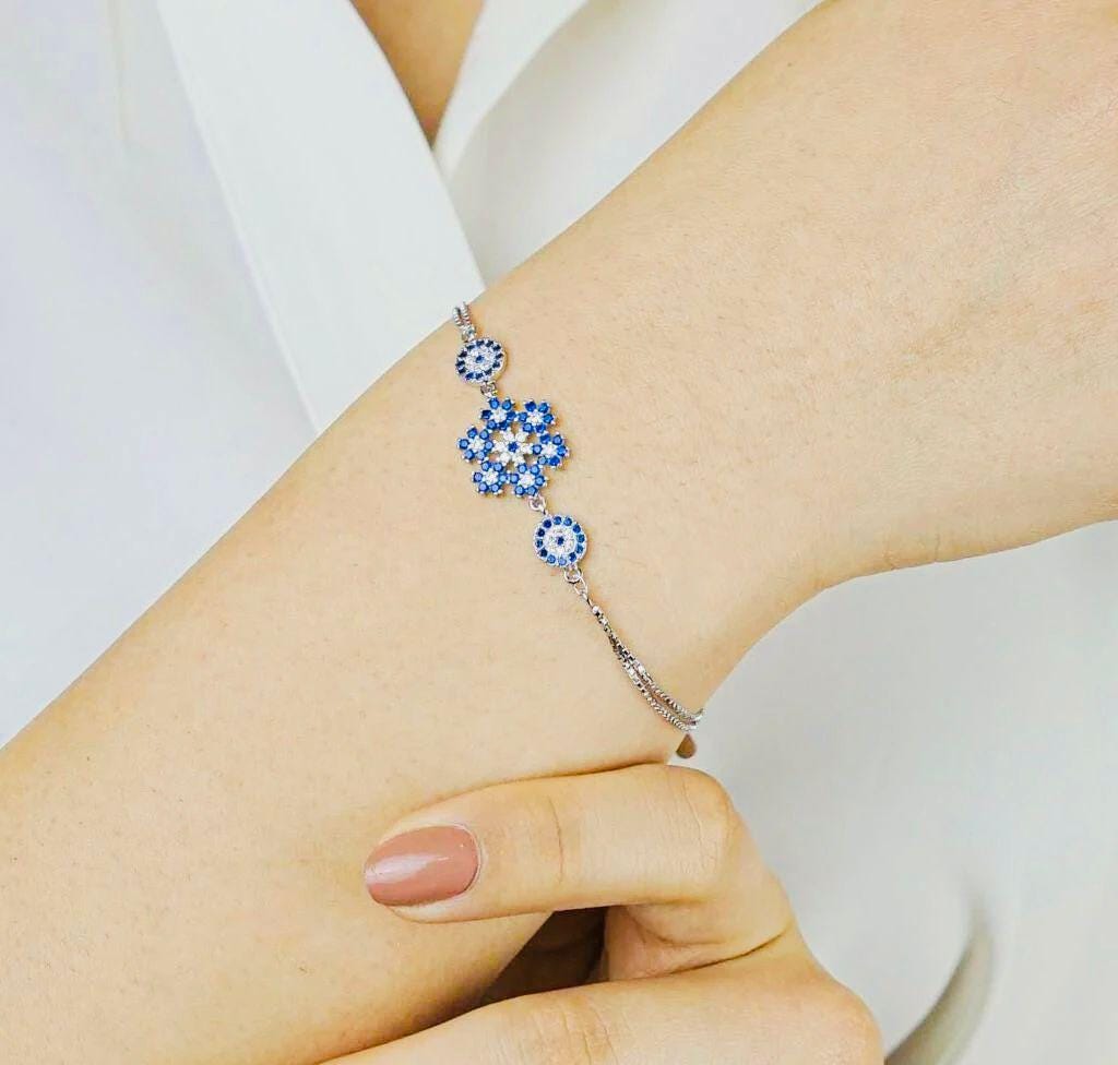 Description This elegant Evil Eye Snowflake Bracelet is crafted from 925 sterling silver. Featuring a symbolic snowflake design with an evil eye detail, it represents both elegance and protection. A meaningful and stylish accessory, perfect for daily wear or as a thoughtful gift.