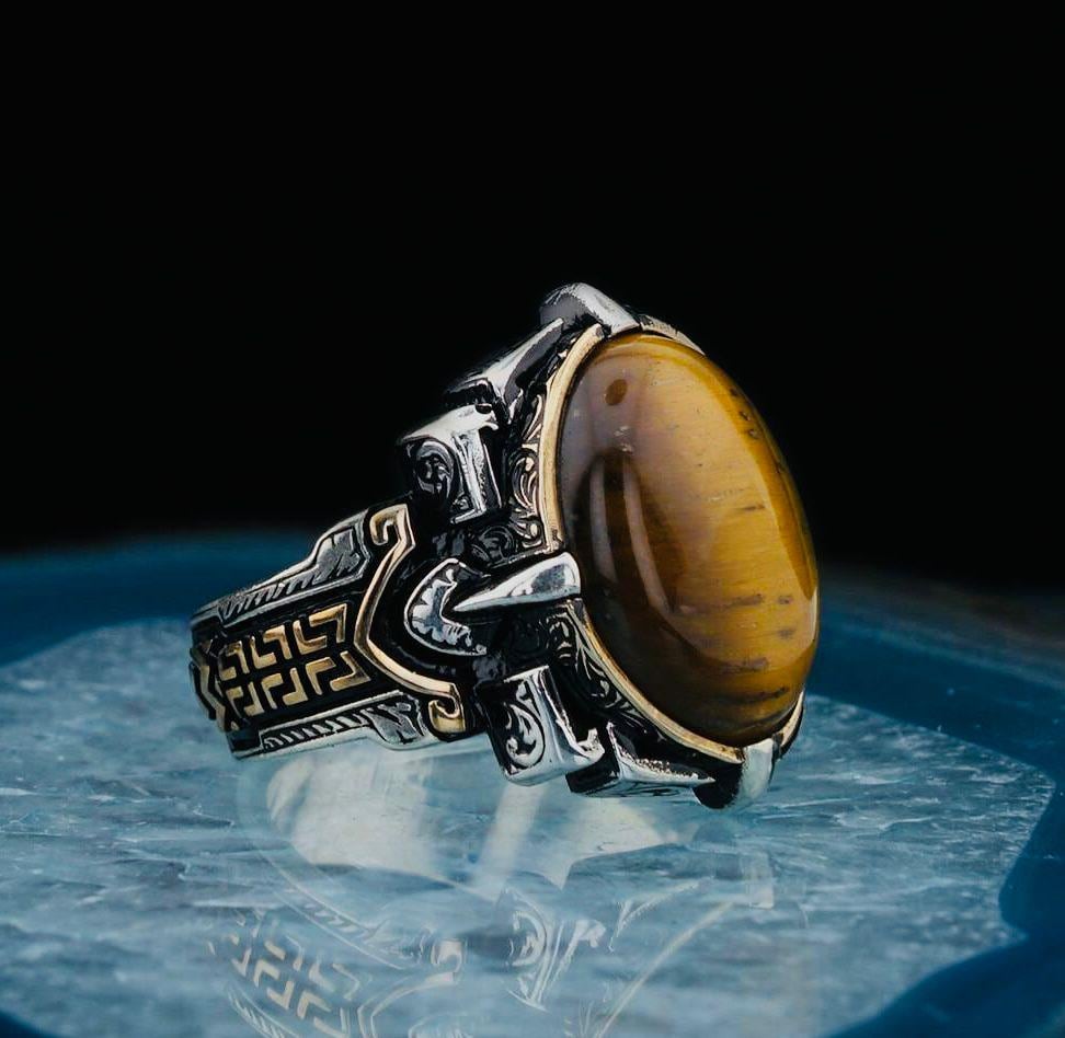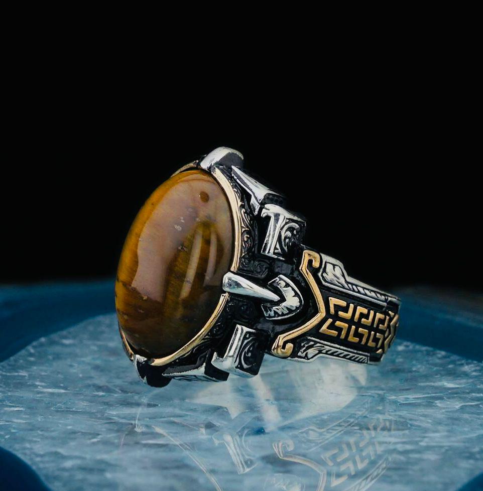 Description: This bold men’s ring is crafted from 925 sterling silver and features a natural oval Tiger Eye stone. Known for its grounding and protective qualities, the Tiger Eye adds strength and confidence to your style. A perfect accessory for daily wear or a meaningful gift for him.