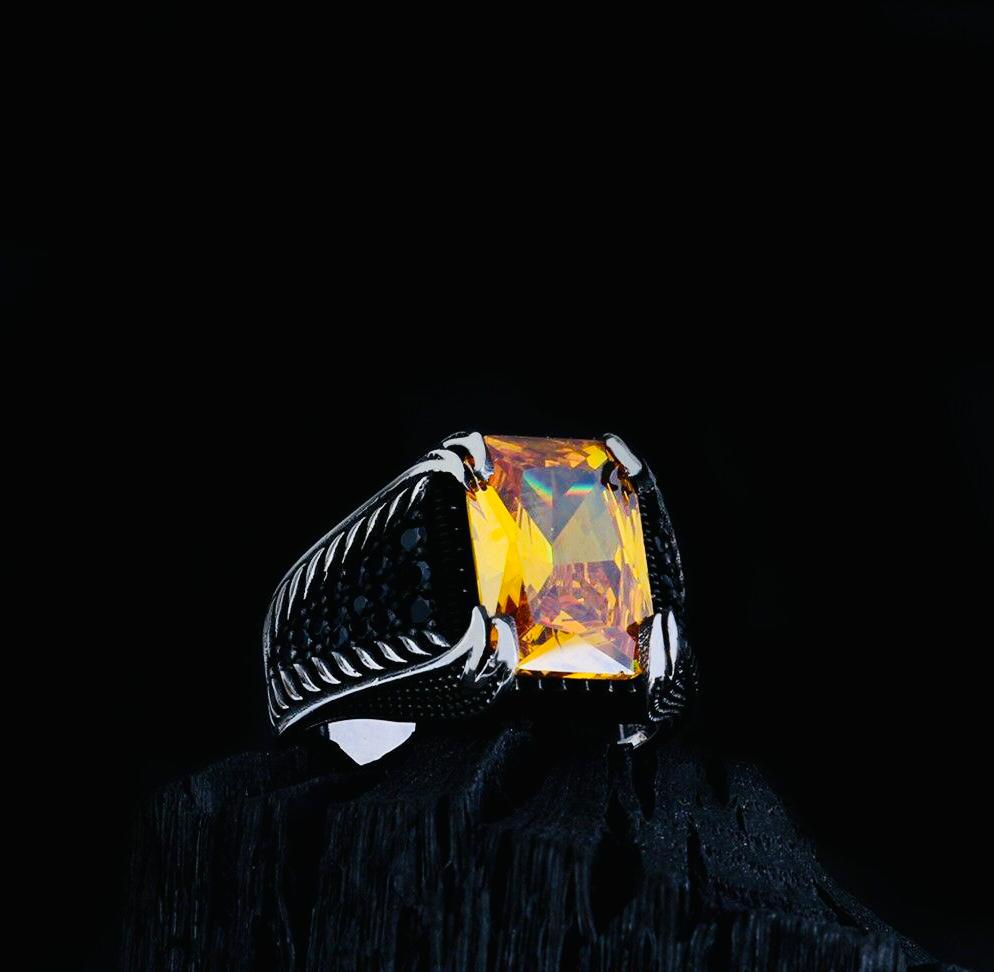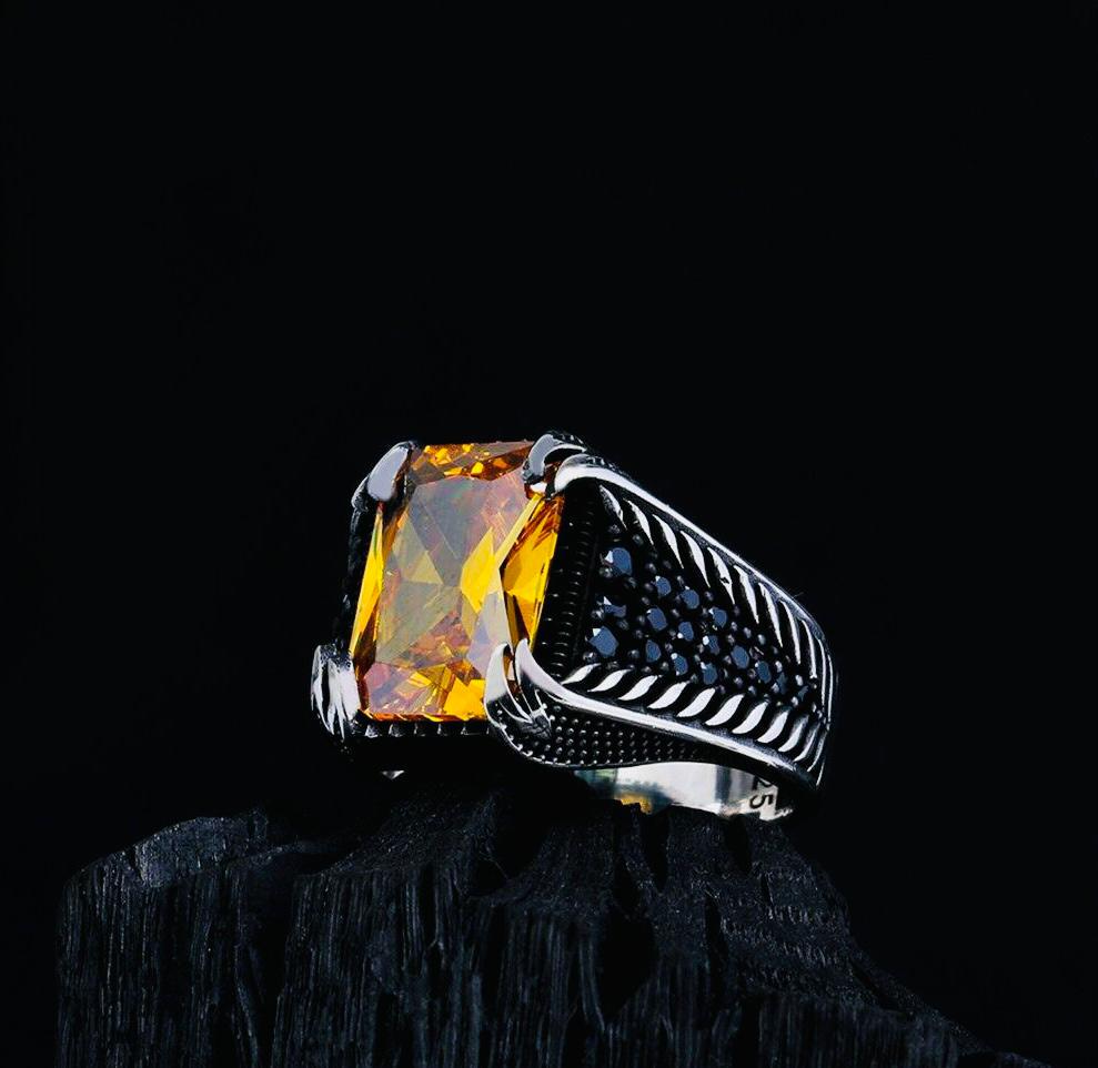 925 Sterling Silver Men’s Ring with Yellow Zircon & Micro Side Stones