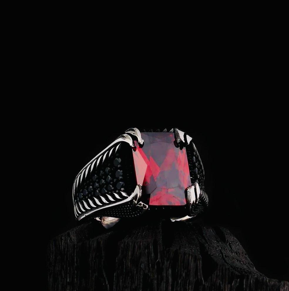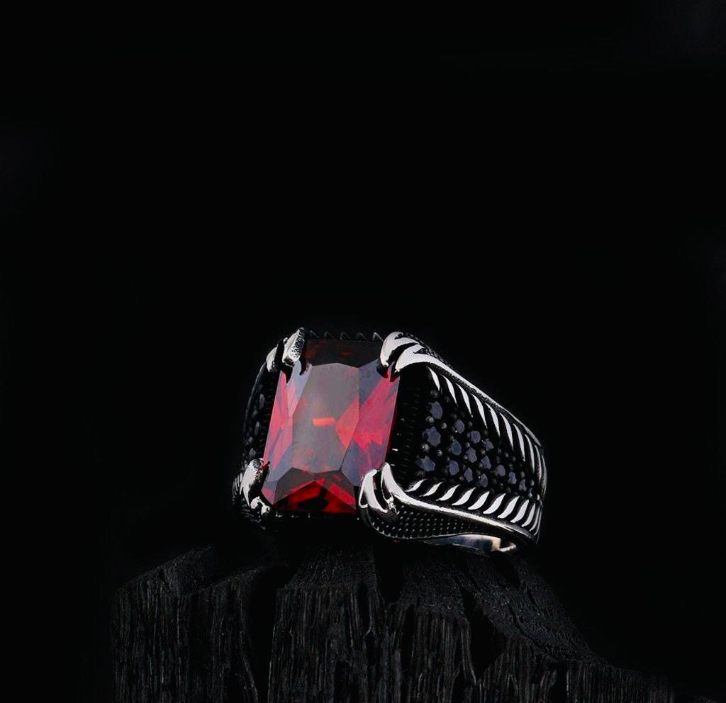 Description This elegant men’s ring features a red zircon stone with fine micro-detail craftsmanship, set in solid 925 sterling silver. Weighing approximately 12 g and featuring a 10 x 14 mm stone, it’s designed to combine strength with sophistication. Packaged in a ring box with a cleaning cloth, it makes an excellent gift for any occasion.