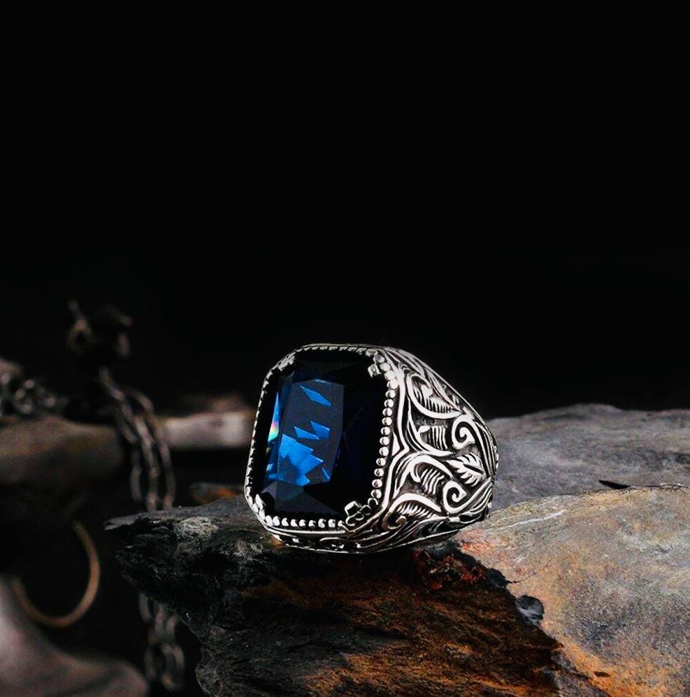 925 Sterling Silver Men’s Ring with Blue Zircon Stone – Handmade Design