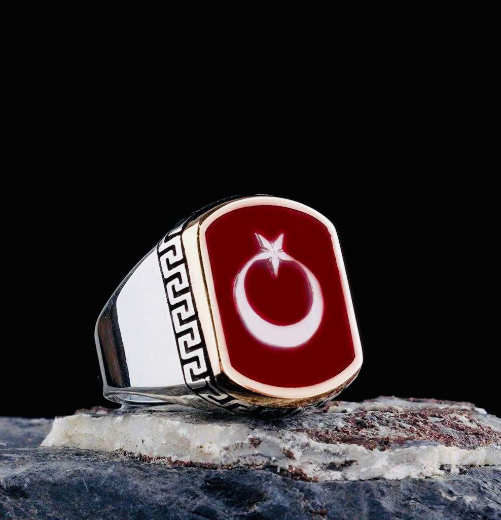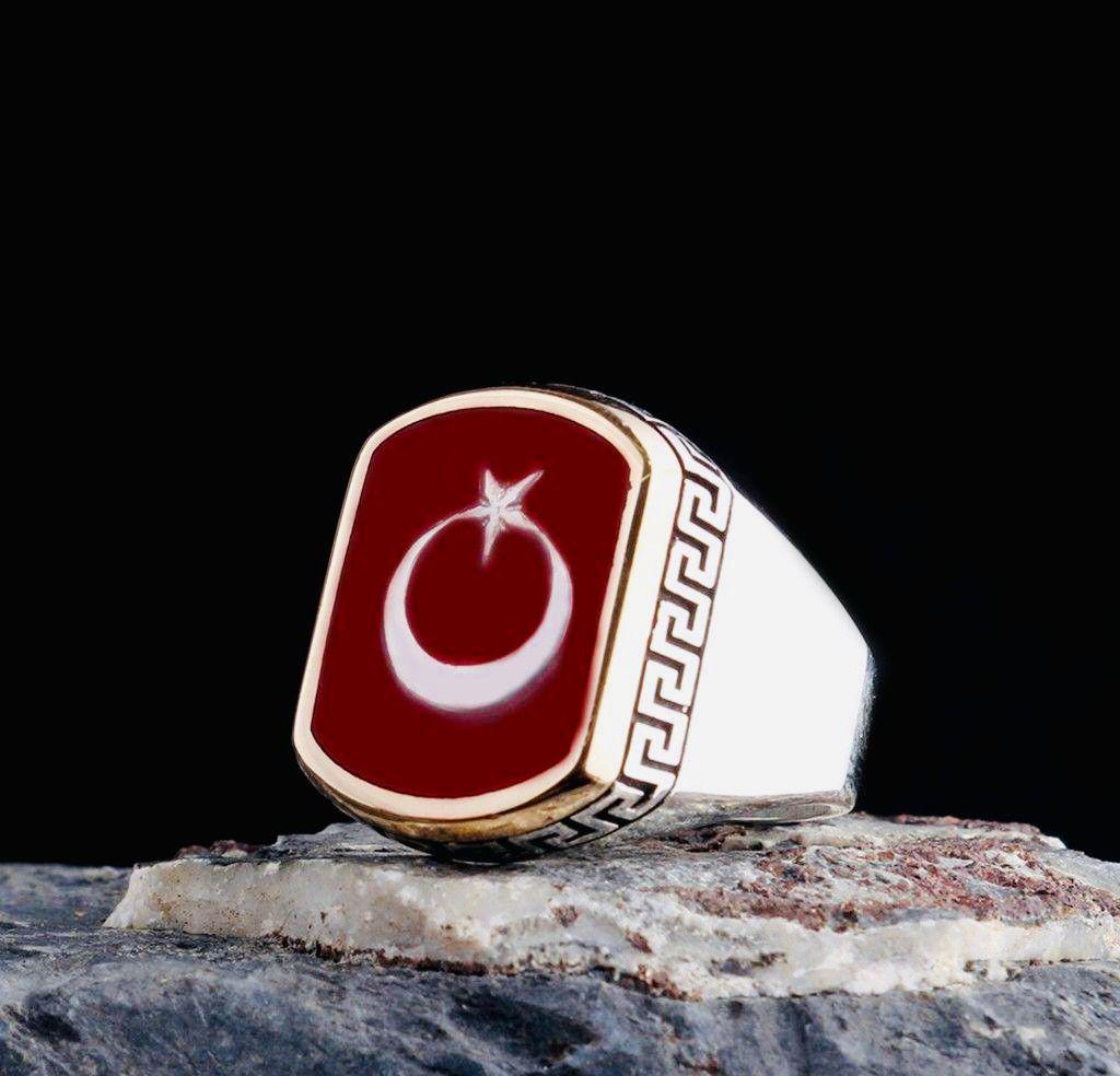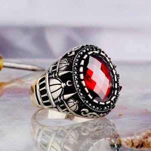 Description This handcrafted men’s ring features a Crescent & Star design with red enamel, symbolizing strength, heritage, and elegance. Made of 925 sterling silver, it weighs about 15 g and measures 16 x 20 mm. Delivered with a ring box and cleaning cloth, it’s a bold accessory and a meaningful gift option.