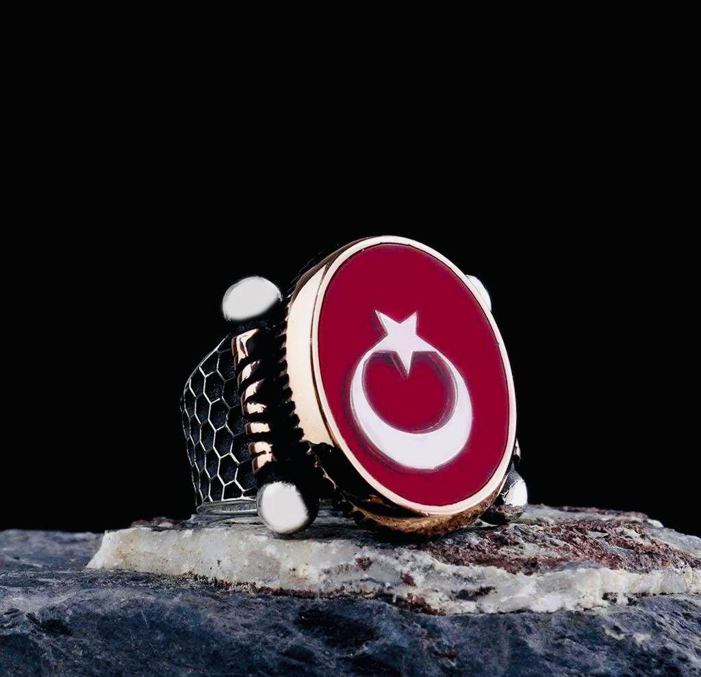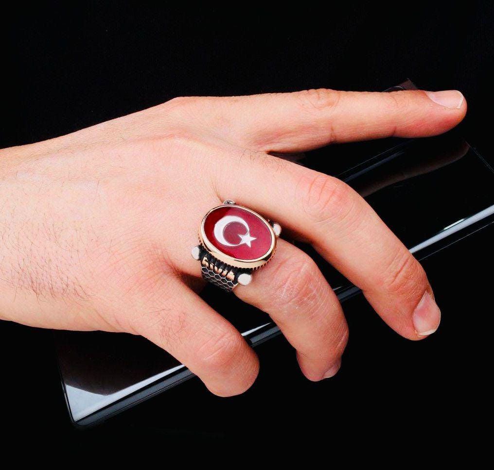 Description This bold men’s ring features a Crescent & Star design with red enamel, symbolizing strength and heritage. Handcrafted from 925 sterling silver, it weighs approximately 16 g and measures 16 x 20 mm. Delivered with a ring box and cleaning cloth, making it both a meaningful accessory and a perfect gift choice.