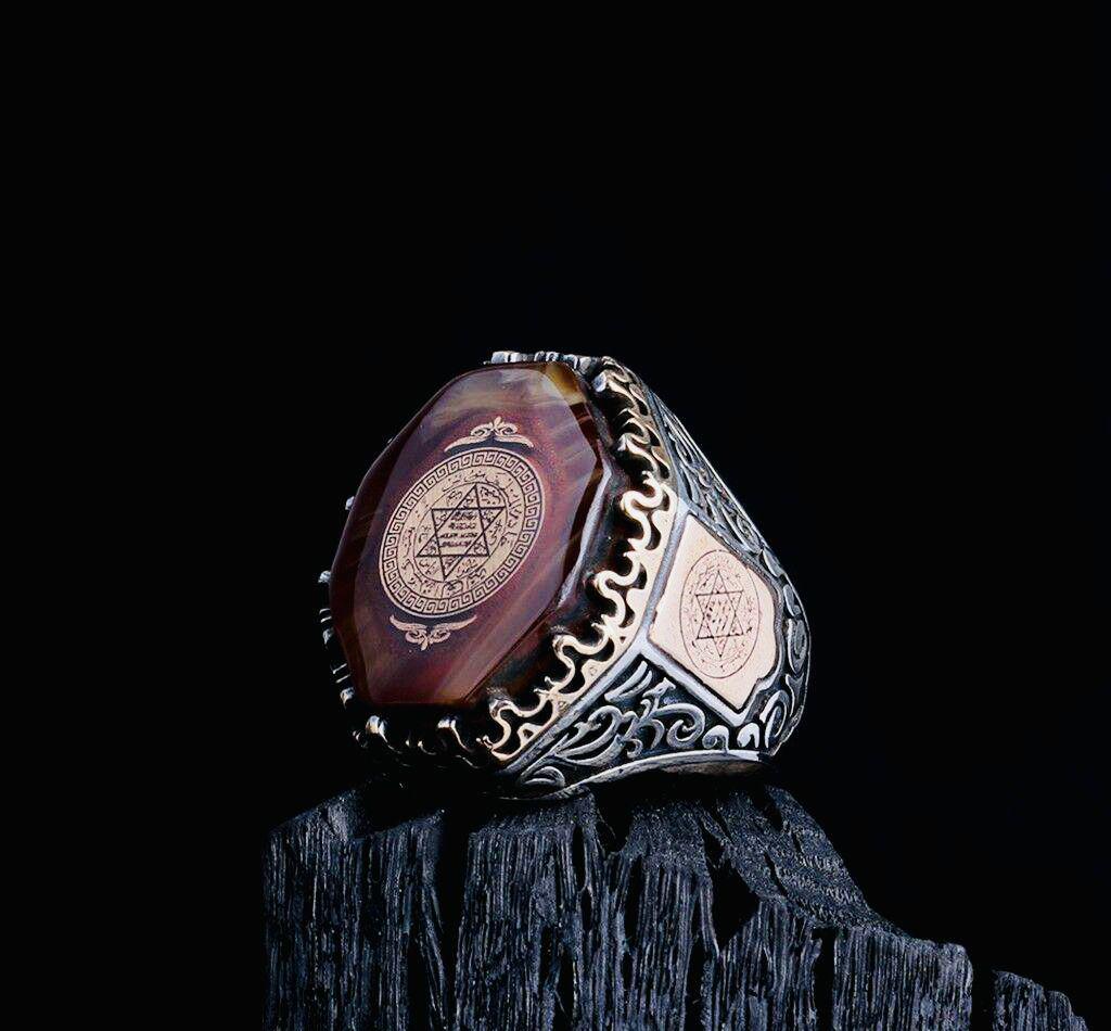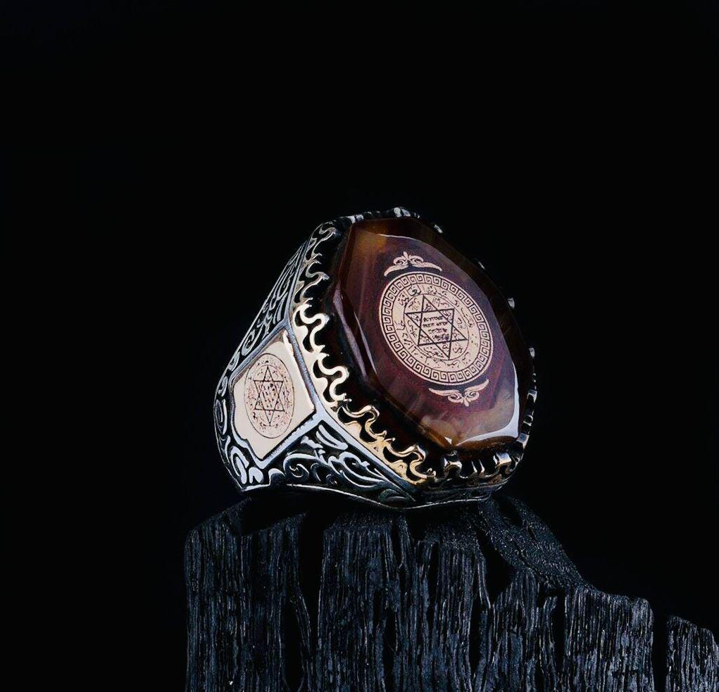 Description This handcrafted men’s ring features the Seal of Solomon engraved on amber stone, set in 925 sterling silver. With its bold 23 x 30 mm size and average weight of 22 g, it reflects strength, elegance, and deep symbolism. Delivered with a ring box and cleaning cloth, making it a meaningful and impressive gift.