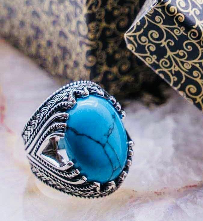 This bold men’s ring is crafted from 925 sterling silver and features a striking turquoise stone. Known for its protective and calming properties, the turquoise adds both elegance and meaning to this piece. Perfect as a statement accessory for everyday wear or as a thoughtful gift for him.