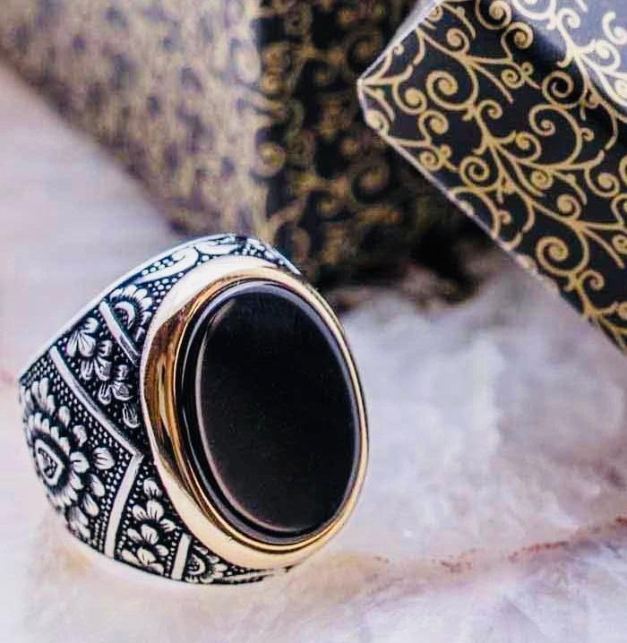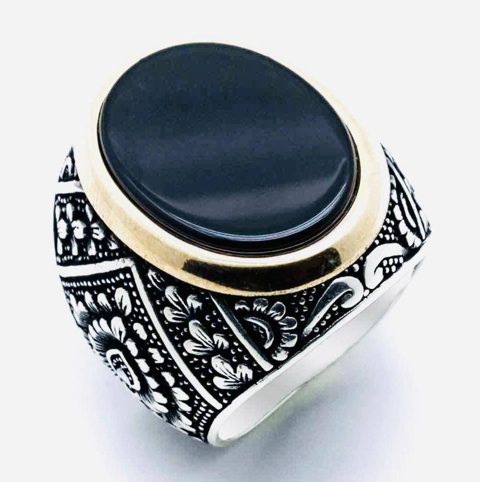 Description: This bold men’s ring is crafted from 925 sterling silver and set with a large oval flat onyx stone. The deep black onyx symbolizes strength and confidence, making this ring the perfect accessory for daily wear or as a meaningful gift for someone special.