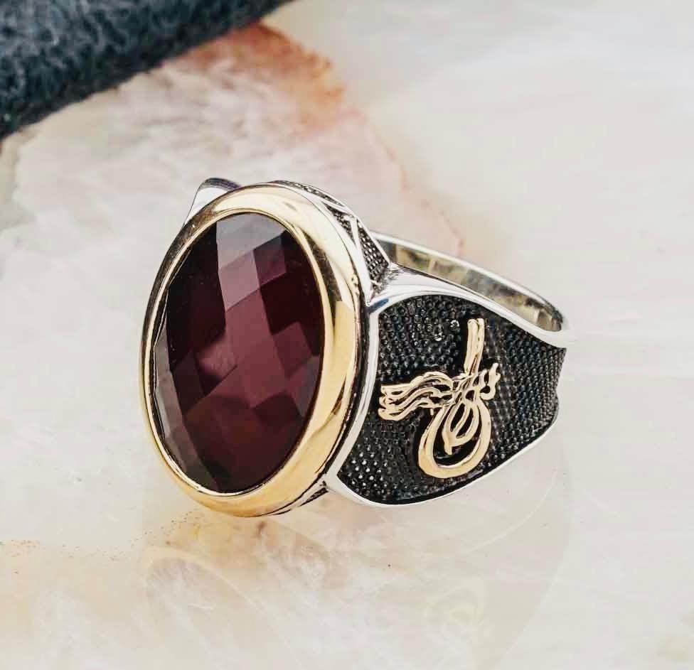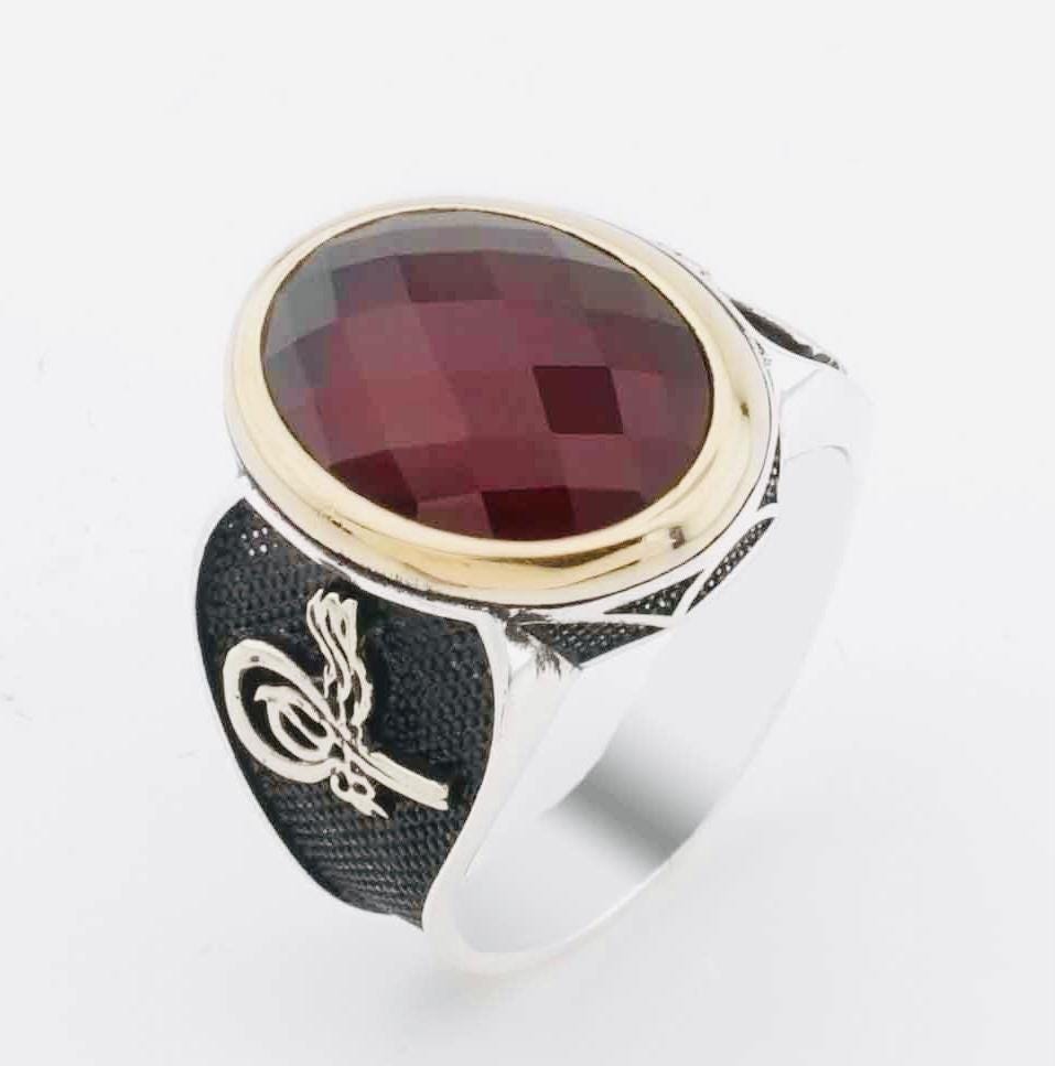 925 Sterling Silver Men’s Ring with Red Zircon & Ottoman Tughra Design