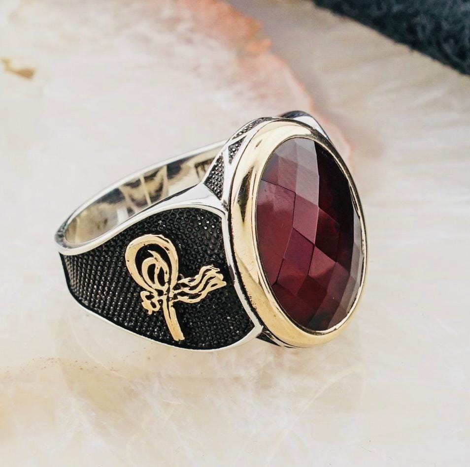 Description: This men’s ring is crafted from 925 sterling silver, featuring a striking red zircon stone combined with an intricate Ottoman Tughra design. Bold yet elegant, this unique piece is perfect for everyday wear or as a meaningful gift, blending heritage with modern craftsmanship.