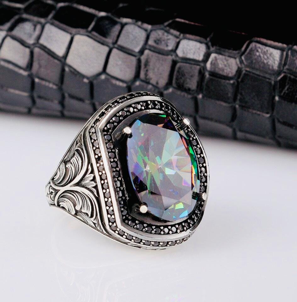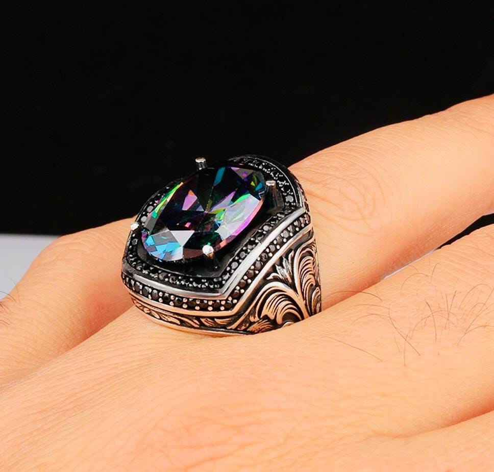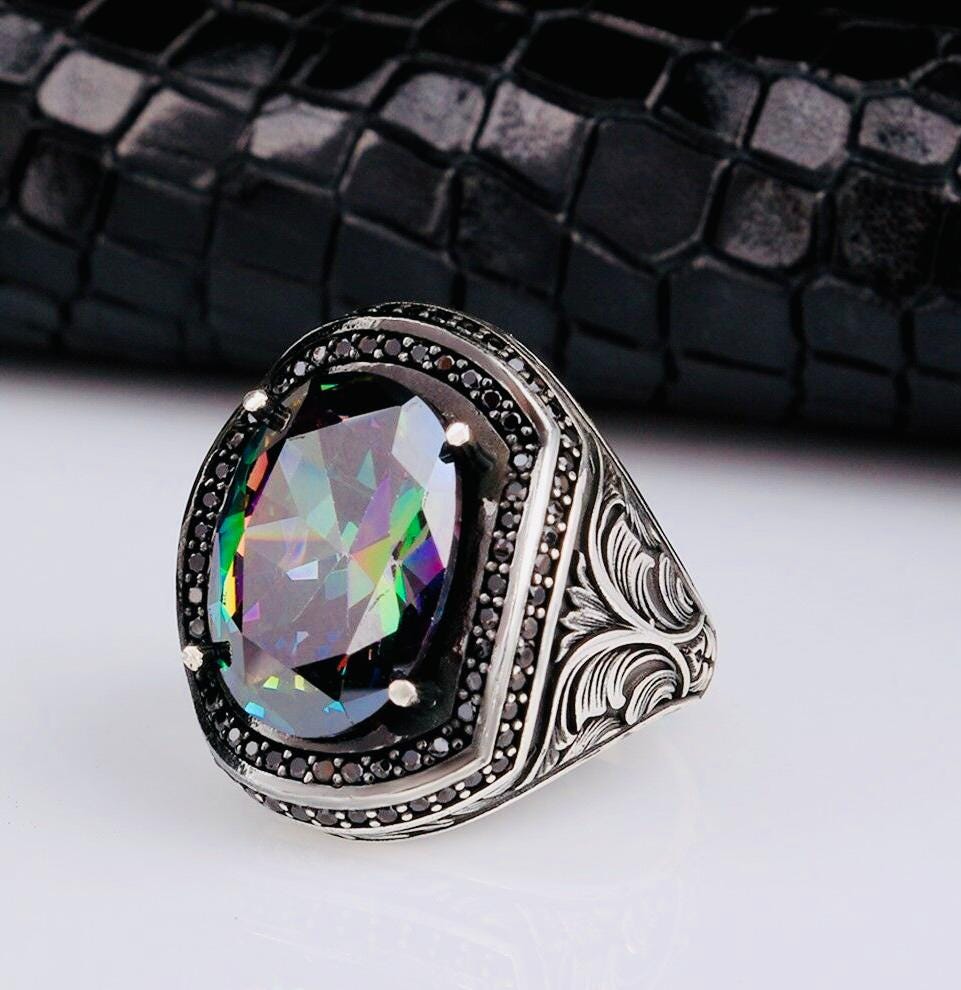 Product Details • Material: 925 sterling silver • Stone: Mystic Topaz • Weight: 16 g • Stone Size: 13x18 mm • Handcrafted • Comes with ring box and cleaning cloth