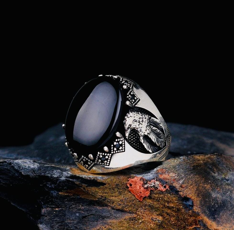 Description This handcrafted men’s ring is made from 925 sterling silver and features a striking onyx stone measuring 11x8 mm, highlighted with an elegant eagle motif. The eagle symbolizes power and freedom, making this piece both stylish and meaningful. Delivered with a ring box and cleaning cloth, it’s ideal for daily wear or as a thoughtful gift for him.
