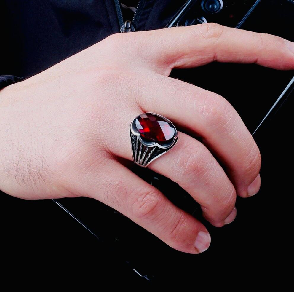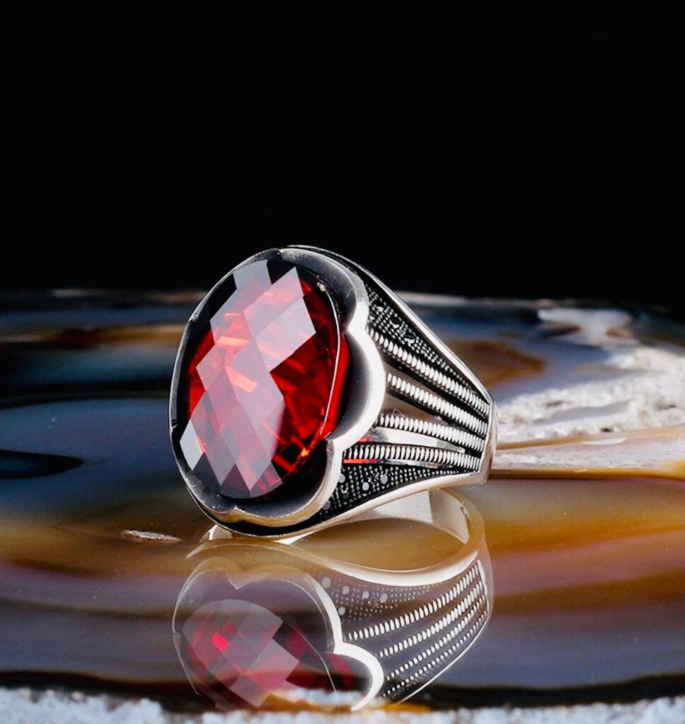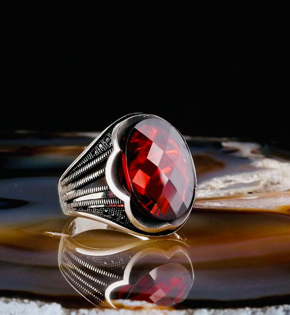 Description: This bold men’s ring is made of 925 sterling silver and features a faceted red zircon stone that shines brilliantly. Symbolizing passion and strength, the deep red stone makes this piece stand out as both elegant and powerful. Perfect for daily wear or special occasions, delivered in a ring box with a cleaning cloth, it also makes a thoughtful gift for him.