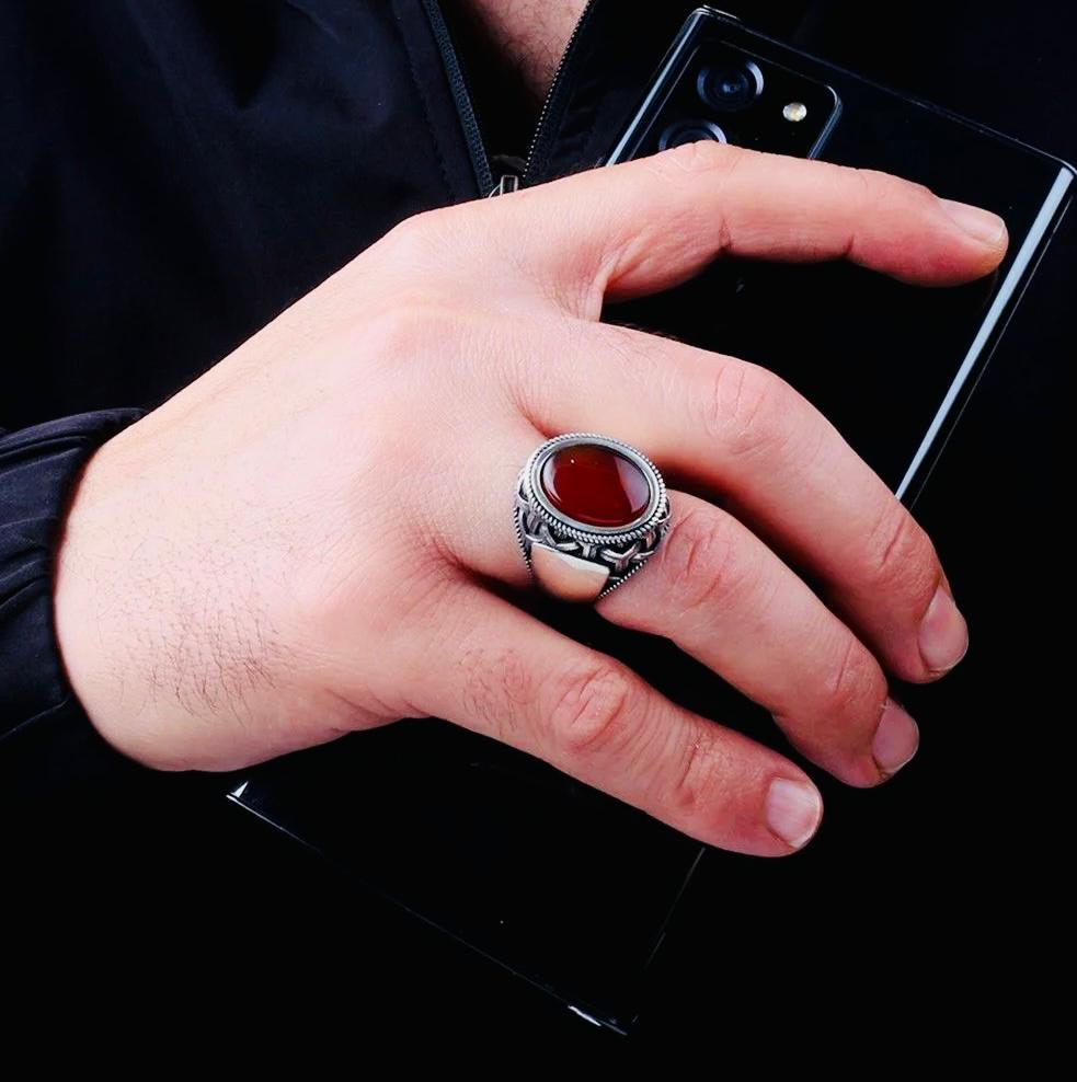 925 Sterling Silver Men’s Ring with Red Agate Stone – Oval Model
