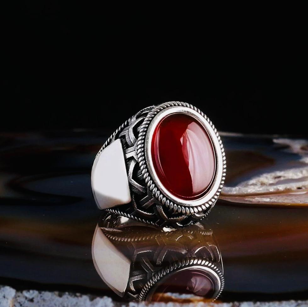 Product Details: • Material: 925 sterling silver • Stone: Red Agate • Stone Size: 11x15 mm • Weight: 16 g • Handcrafted • Comes with ring box and cleaning cloth