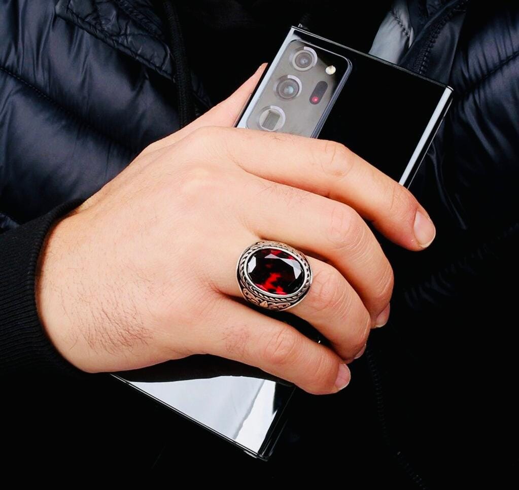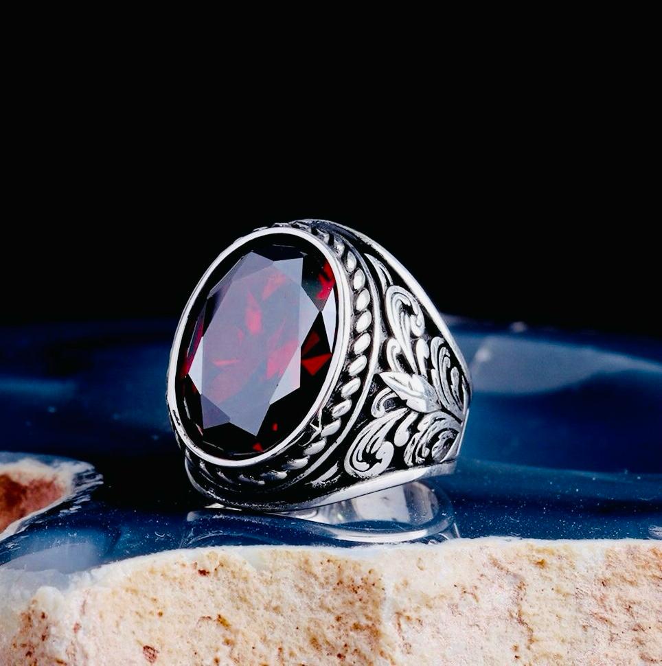 925 Sterling Silver Men’s Ring with Red Zircon Stone