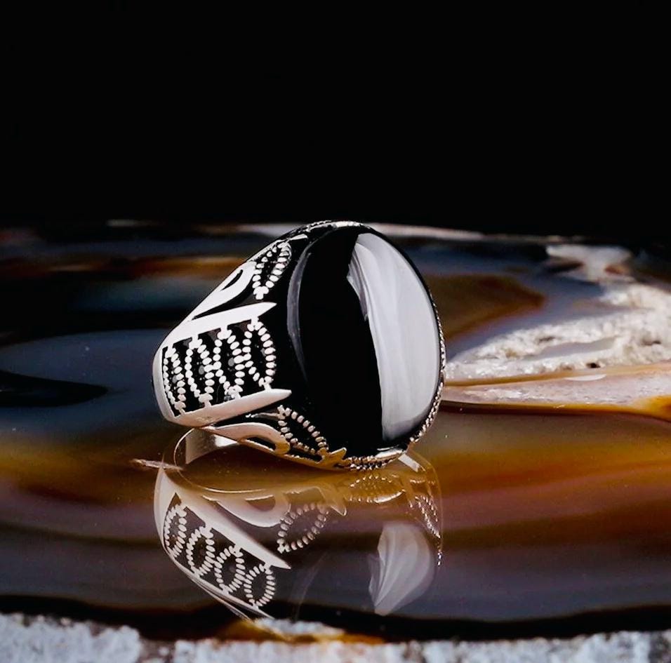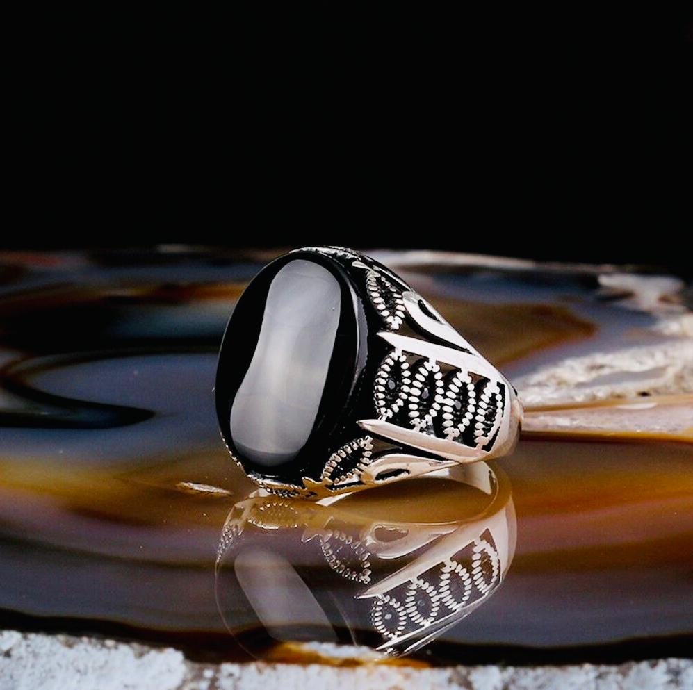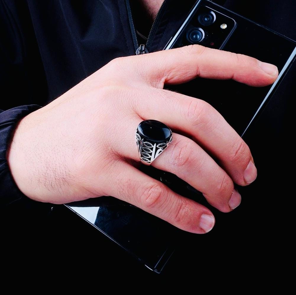 Product Details: • Material: 925 sterling silver • Stone: Onyx • Weight: 8.5 g • Stone Size: 13x18 mm • Handcrafted • Comes with ring box and cleaning cloth