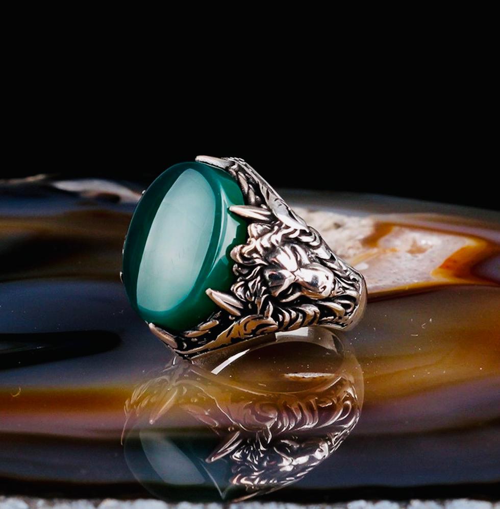 925 Sterling Silver Men’s Ring with Green Agate Stone – Lion Design