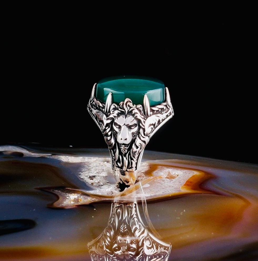 Description: This men’s ring is handcrafted from 925 sterling silver and features a bold lion design paired with a green agate stone measuring 13x18 mm. The lion symbolizes strength and courage, making this ring a powerful statement piece. Delivered in an elegant ring box with a cleaning cloth, it’s a perfect accessory for daily wear or a meaningful gift for someone special.