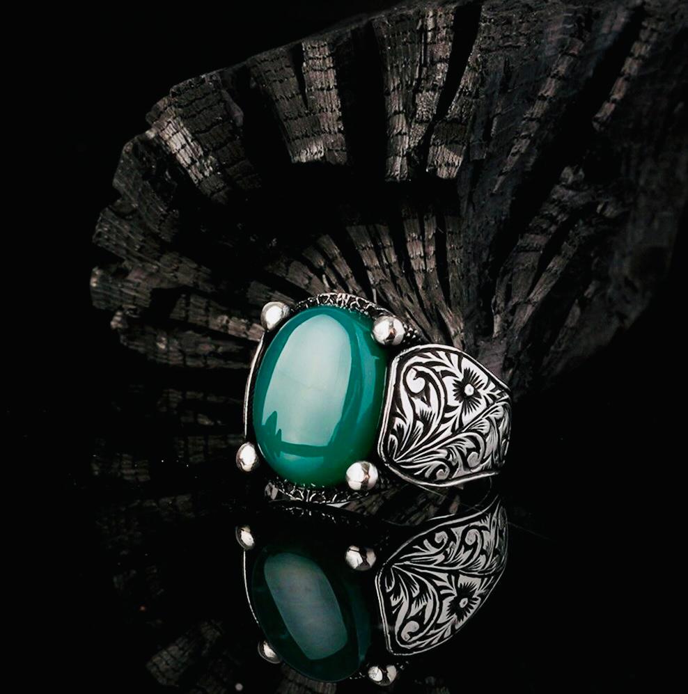 Product Details: • Material: 925 sterling silver • Stone: Green agate • Weight: 10.5 g • Stone Size: 13x18 mm • Handcrafted with engraved details • Comes with ring box and cleaning cloth