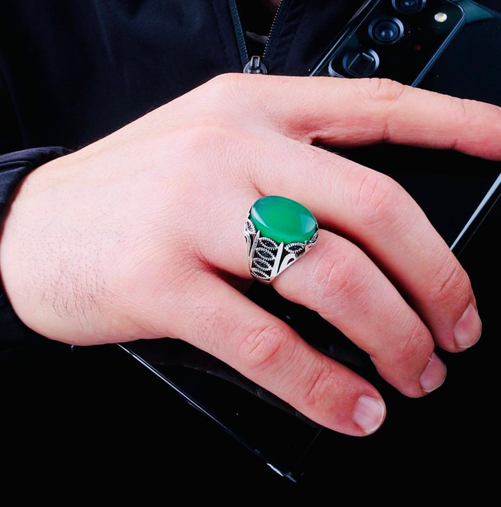 925 Sterling Silver Men’s Ring with Green Agate Oval Stone