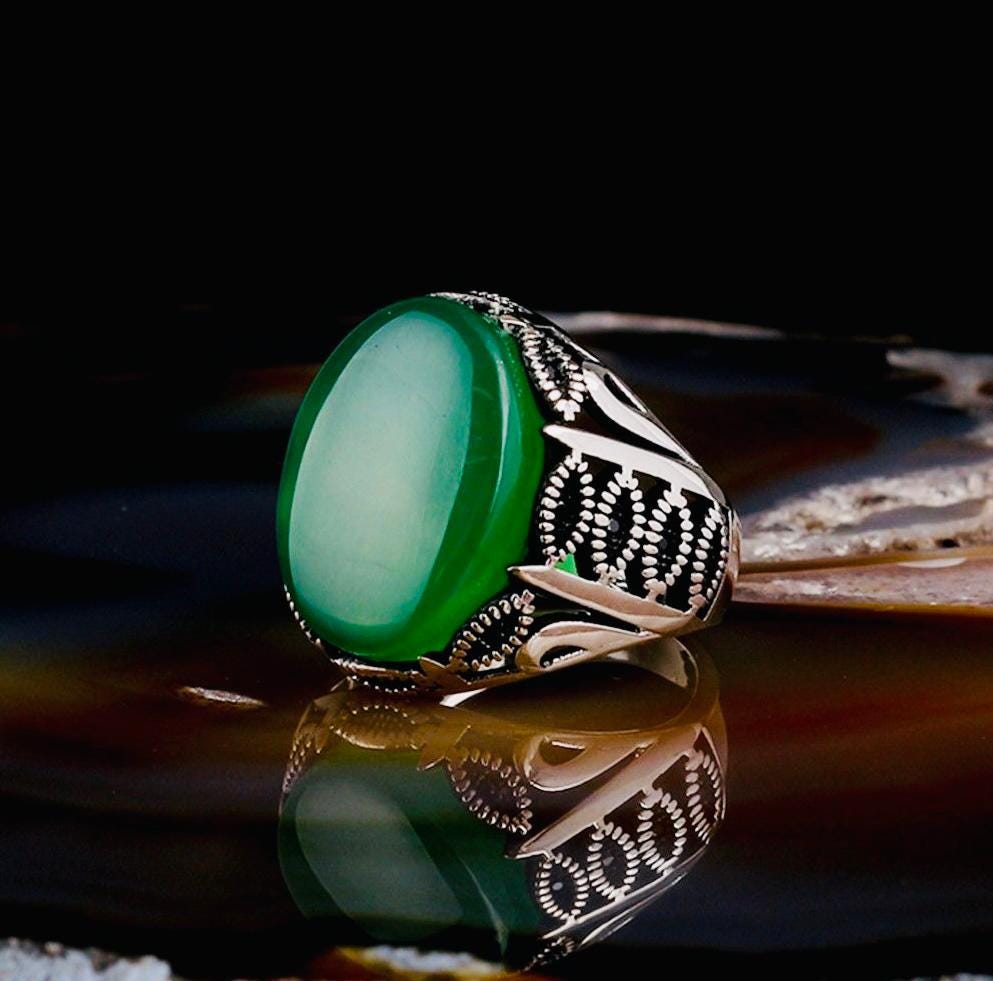 Product Details: • Material: 925 sterling silver • Stone: Green agate • Weight: 8.5 g • Stone Size: 13x18 mm • Handcrafted • Comes with ring box and cleaning cloth