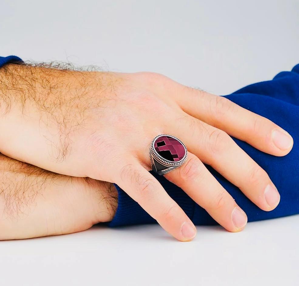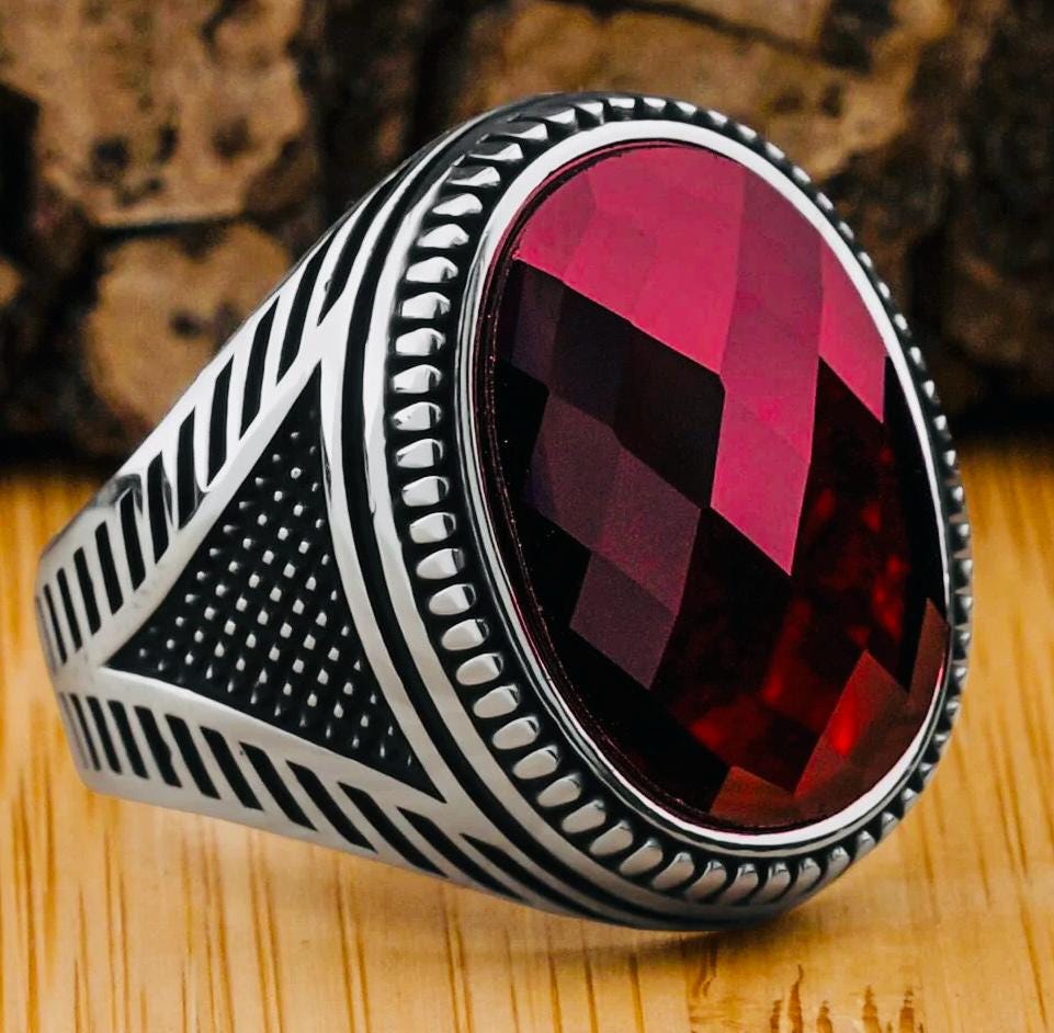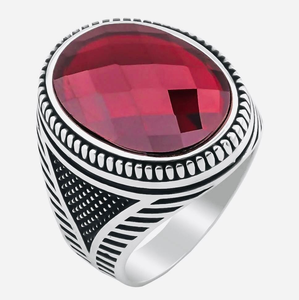 925 Sterling Silver Men’s Ring with Red Zircon Stone