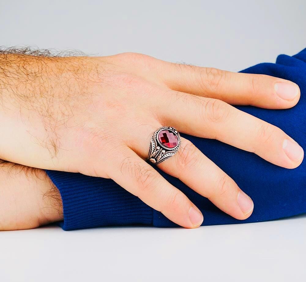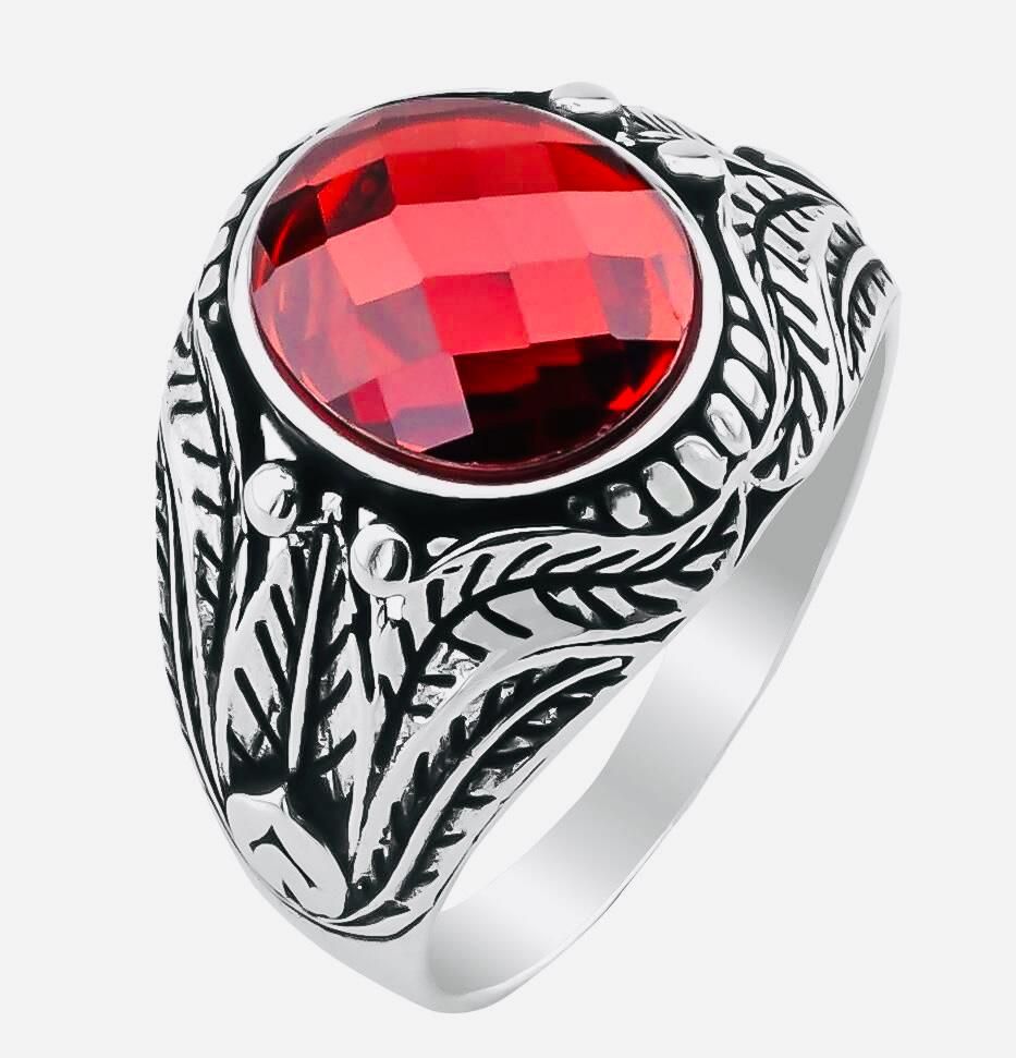 925 Sterling Silver Men’s Ring with Red Zircon Stone