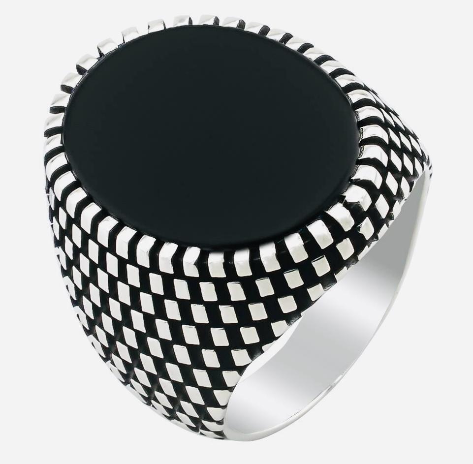 925 Sterling Silver Men’s Ring with Black Onyx Stone and Patterned Design
