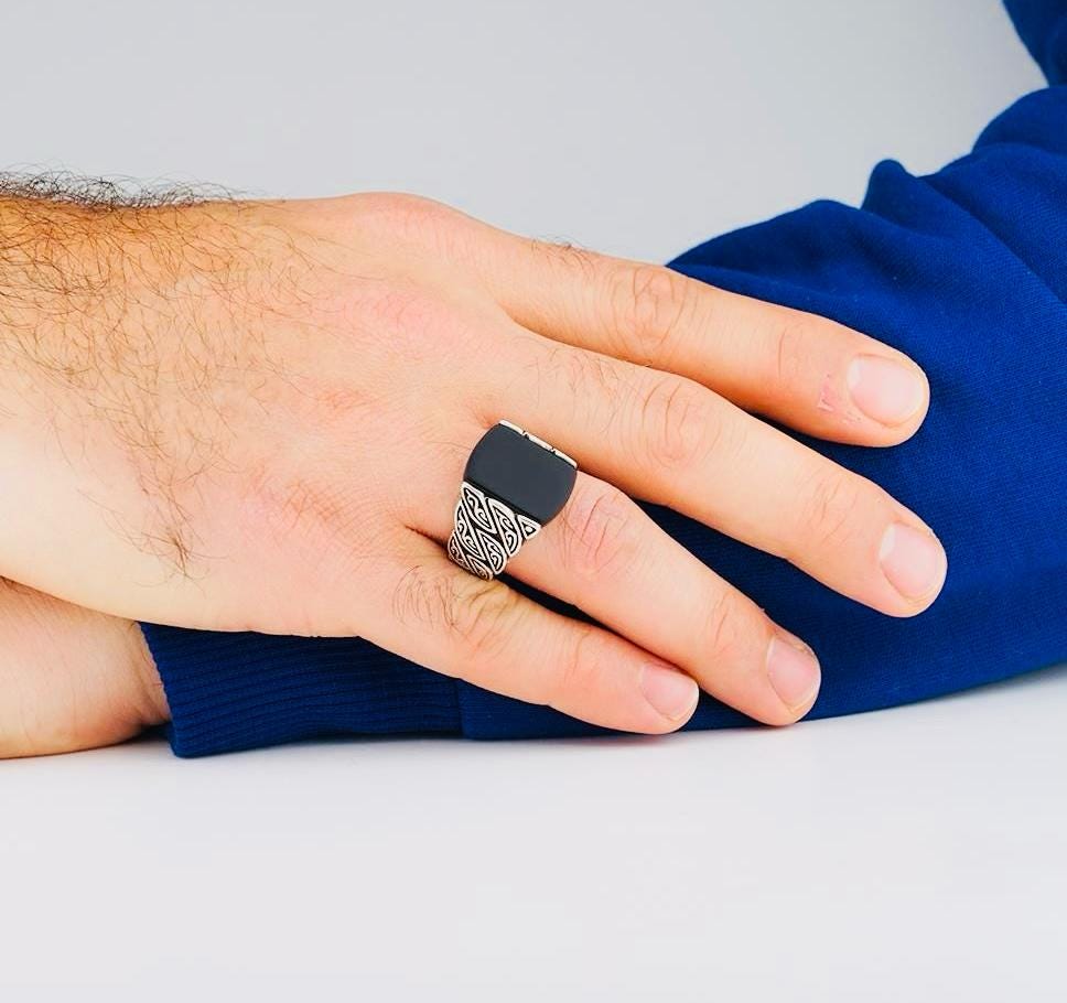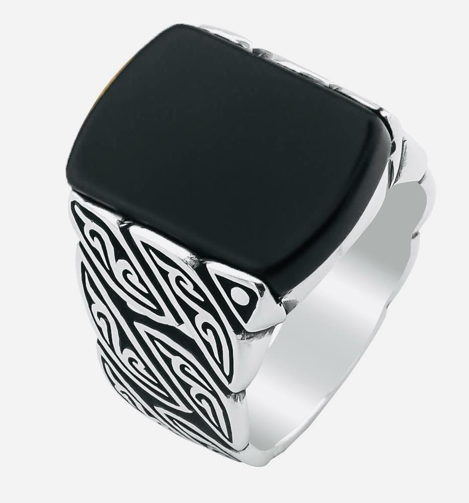 Product Details: • Material: 925 sterling silver • Stone: Black Onyx • Weight: approx. 11.8 g (may vary by size) • Dimensions: 1.3 cm x 1.8 cm • Finish: Polished • Comes in a ring box